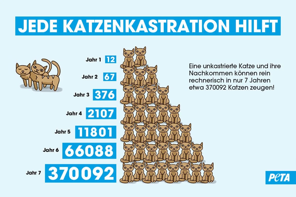 Rein rechnerisch können eine einzige Katze und ihre Nachkommen somit in nur sieben Jahren 370.000 weitere Katzen in die Welt setzen. Eine flächendeckende Kastrationspflicht für alle Freigängerkatzen gilt als einzige nachhaltige Lösung gegen die Katzenüberpopulation.