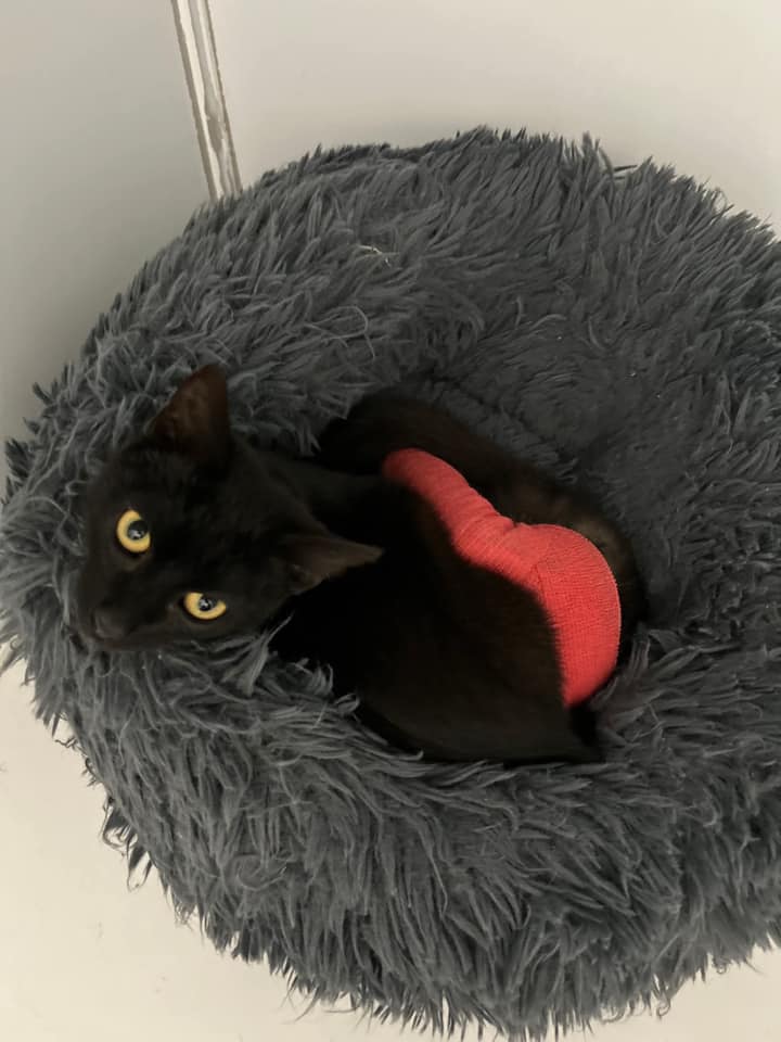 Querida 🖤 Der Preis für den Pechvogel des Monats geht an Querida 🙁 Unsere arme Schwarze Schönheit Querida hatte einen Unfall im Familienzimmer. Sie hat sich auf für uns unerklärliche Weise das Bein gebrochen. Es ist eine sehr dünne, schmale Fraktur in ihrem Oberschenkelknochen. Wir haben bemerkt das sie humpelt und haben sie sofort zum VET gebracht. Das Röntgen war leider eindeutig. Eine Operation hielt der VET für nicht angebracht. Sie hat stattdessen diesen Verband bekommen. Wir hoffen es heilt alles ganz schnell und sie ist diesen Merkwürdigen Verband bald wieder los. Biliana überprüft ihn jeden Tag, ob sich keine Stauungen bilden. Sogar Sonntags fährt sie extra ins Shelter. Bitte drückt der Armen die Pfoten das alles gut wird und sie bald wieder bei Ihren Brüdern sein kann.