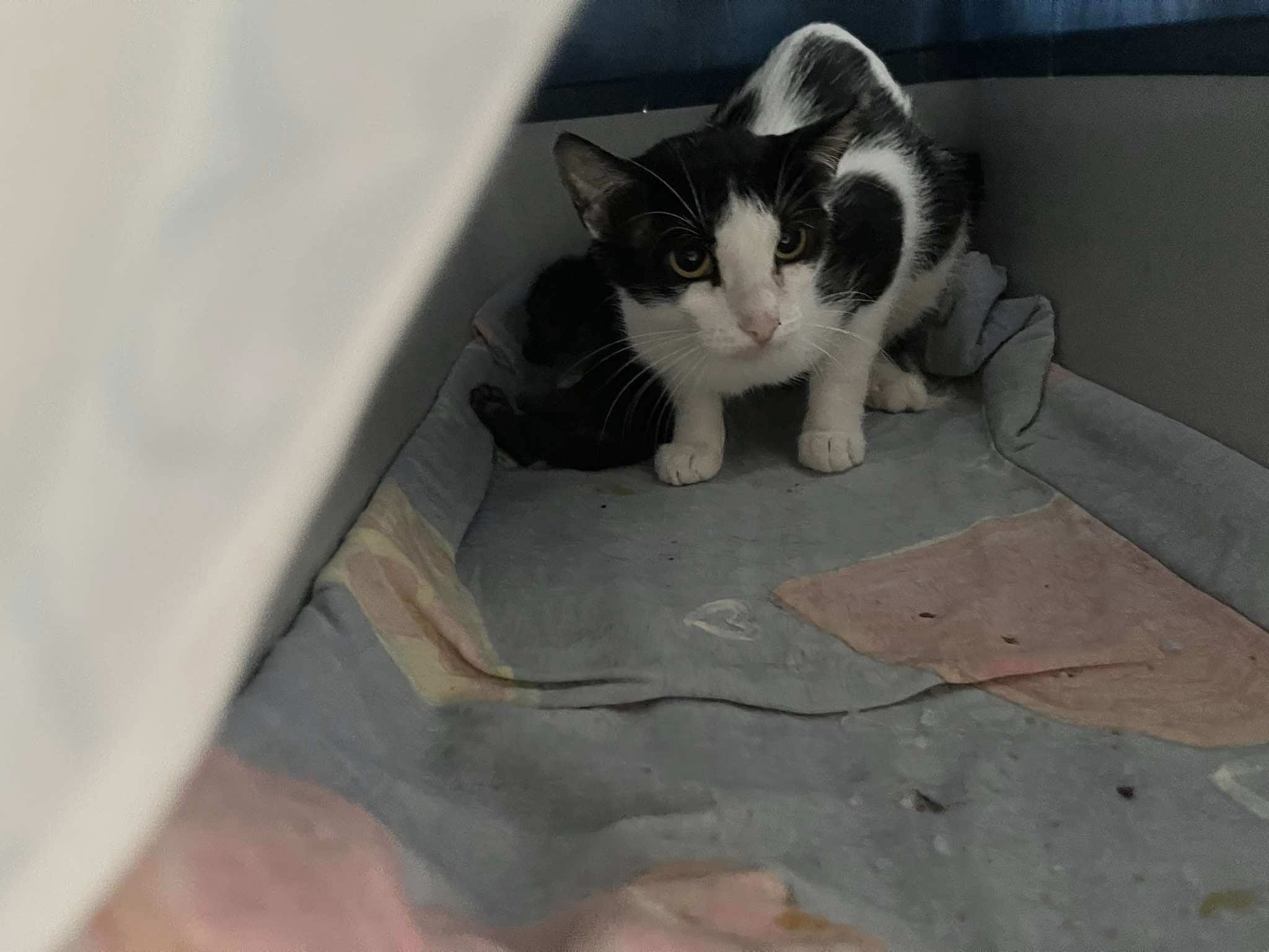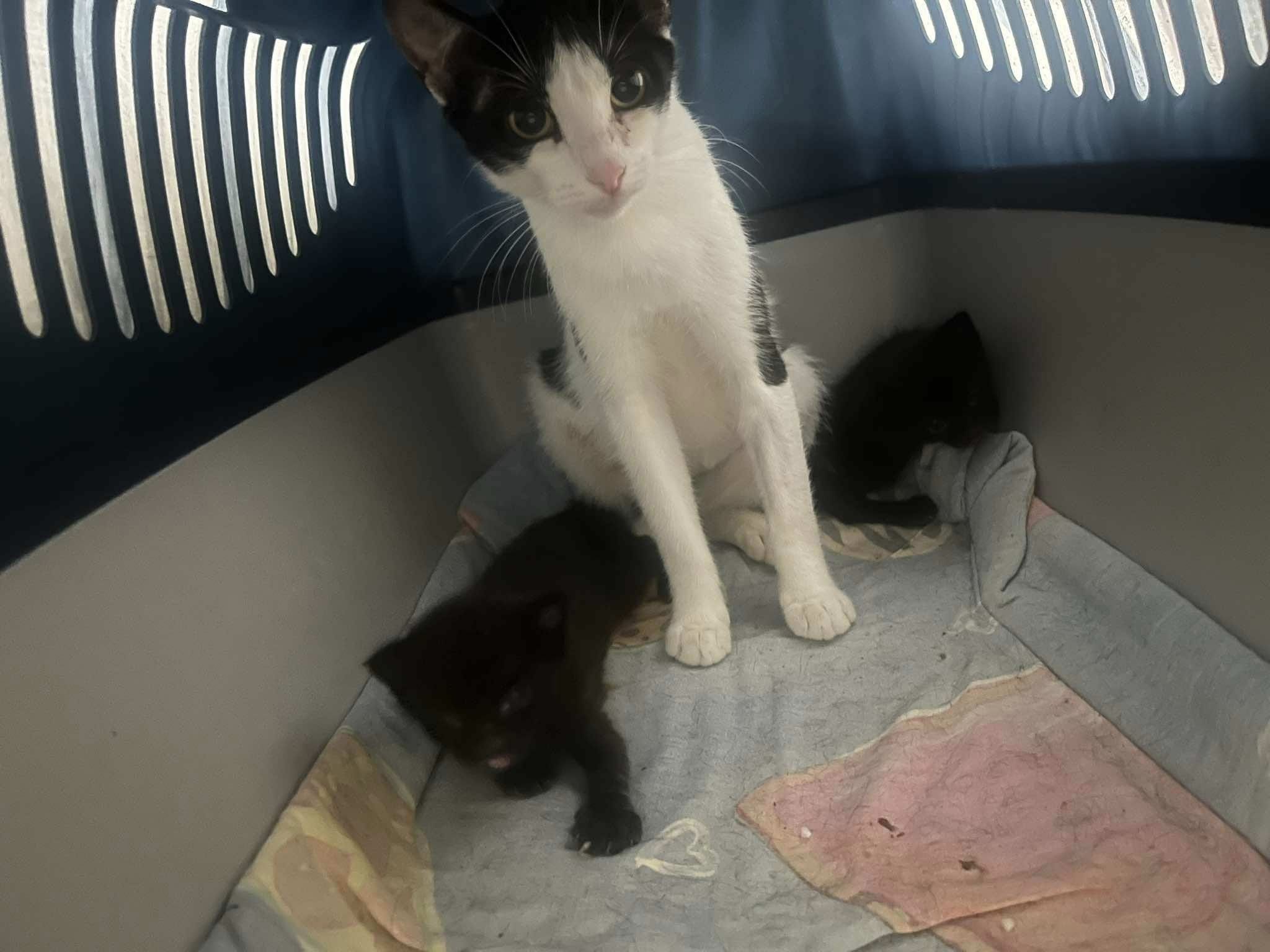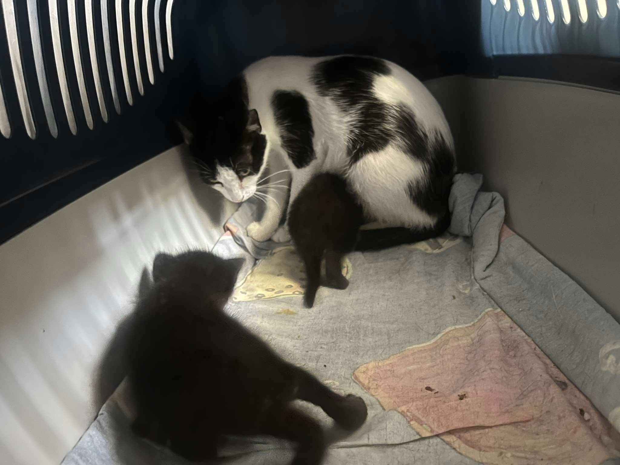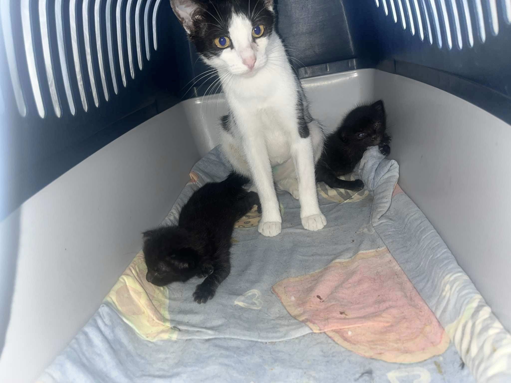 Die Tierärztin fragte bei Billiana an, ob die kleine Kittenfamilie bei WHT Zuflucht bekommen könnte. Die Klinik war überfüllt mit kranken Tieren, sonst müsste man sie auf die Straße zurück lassen. Billiana und die Tierärztin nahmen jedoch an, dass die Mama nicht in der Lage gewesen wäre ihre Kitten auf der Straße zu versorgen. Zu groß war der Stress dem sie ausgesetzt gewesen war. Ebenso fehlte ihr die Erfahrung, da es das erste mal war, dass sie Kitten zur Welt brachte. Am 06.08.2024 übernahm Billiana die Kittenfamilie und brachte Sie zu Nikolina. Dort durften Sie im Keller einen Quarantänekäfig beziehen, bis im Shelter Platz in der Quarantäne war.