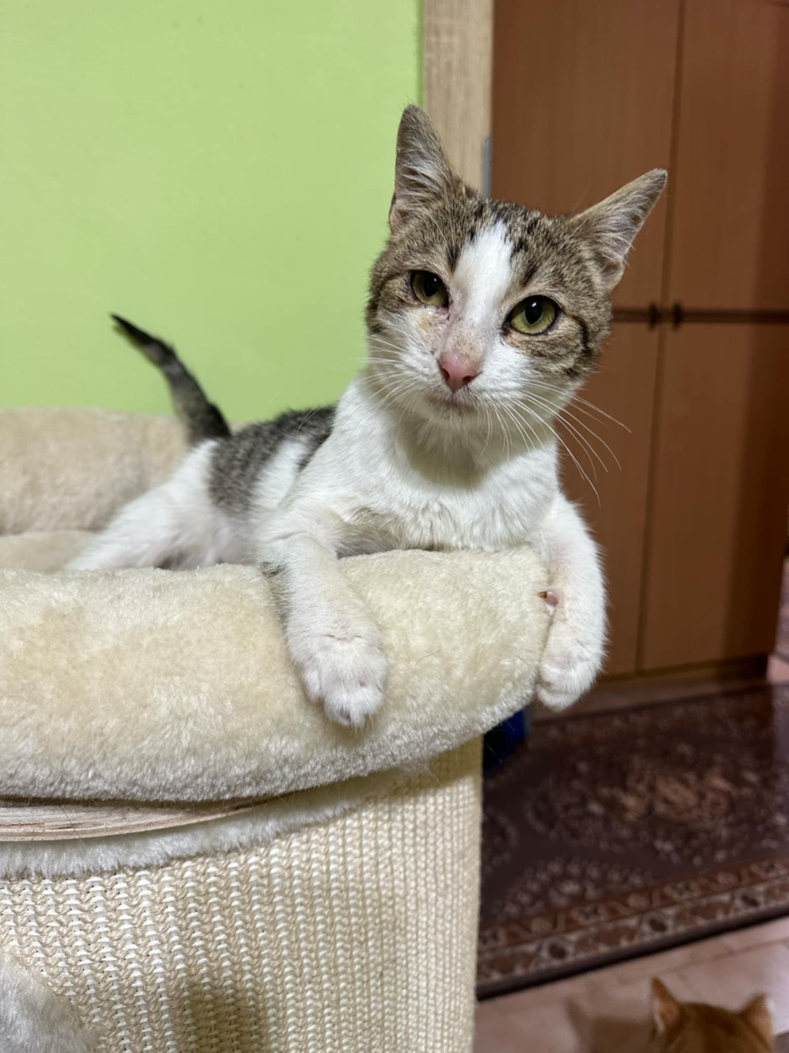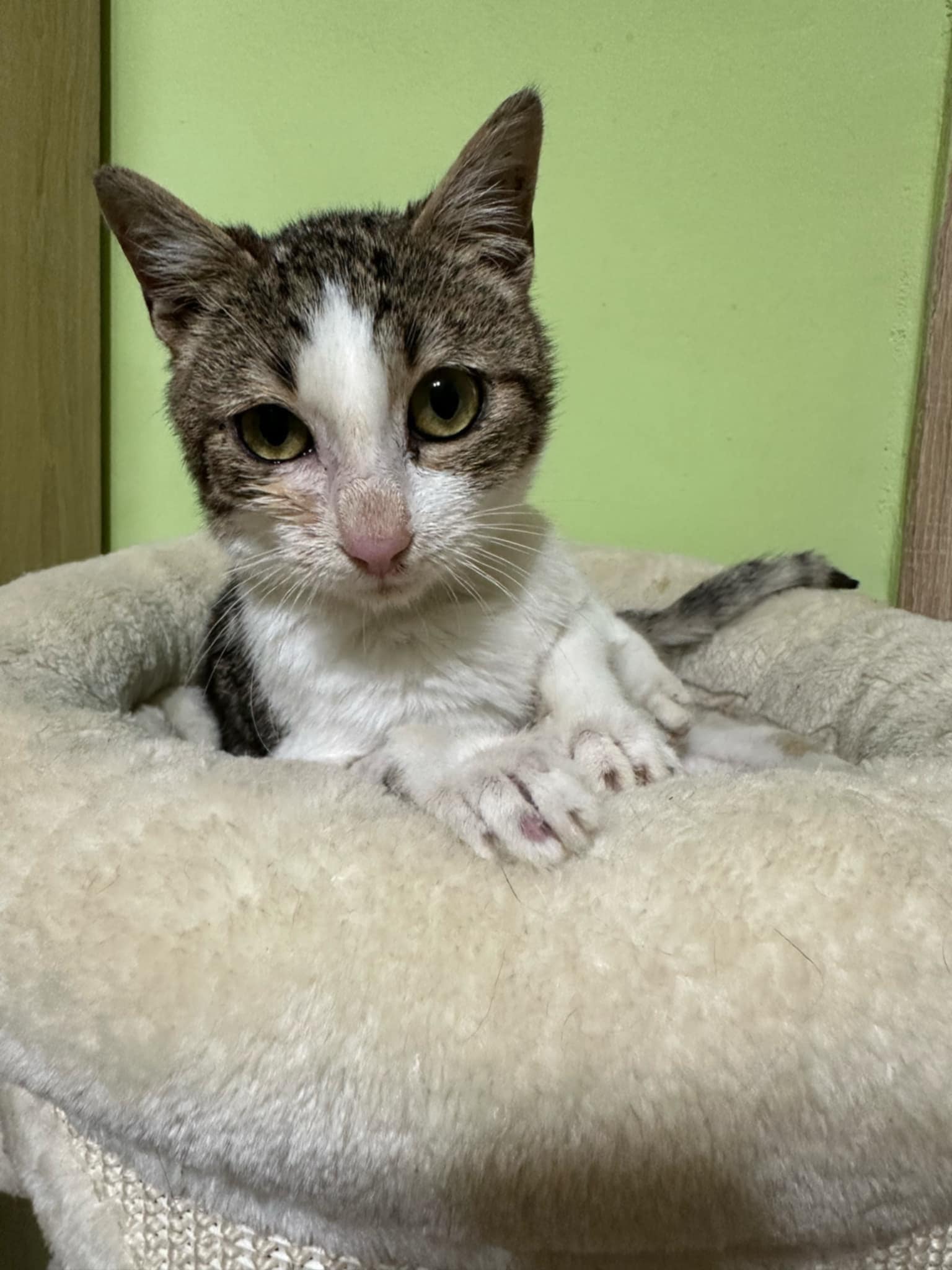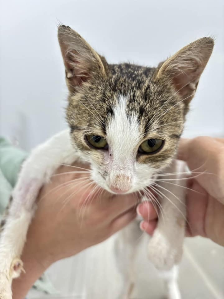 Dieses kleine Mädchen braucht ein Zuhause. Am 4. Oktober, als ich auf dem Grundstück eines Kunden arbeitete, wurde dieses kleine Mädchen auf der Straße neben mir von einem Auto angefahren. Mein Kunde half mir, das Kätzchen einzufangen. Es stellte sich heraus, dass das kleine Baby (es ist 3-4 Monate alt) sehr schwer verletzt ist und dringend tierärztliche Versorgung braucht. Ich rief die Klinik an und der Tierarzt bot an, sie zu transportieren, damit ich meine Arbeit beenden kann. Nach der Untersuchung stellte sich heraus, dass das Kätzchen einen Zwerchfellbruch hat und ihr Becken verletzt ist. Wegen des Bruchs war eine dringende Operation notwendig, und während dieser Operation war das Kätzchen kurzzeitig in einem Zustand des klinischen Todes, aber die Ärzte konnten es zurückholen. Mit der zweiten Operation, der des Beckentraumas, rieten sie uns, abzuwarten. Ihrer Meinung nach kann sich das Kätzchen von selbst davon erholen und es ist möglicherweise überhaupt keine Operation erforderlich. Dem kleinen Mädchen geht es jetzt gut und sie kann bald die Klinik verlassen. Sie frisst und benutzt das Katzenklo von selbst. Der FIV/FelV-Test ist negativ.