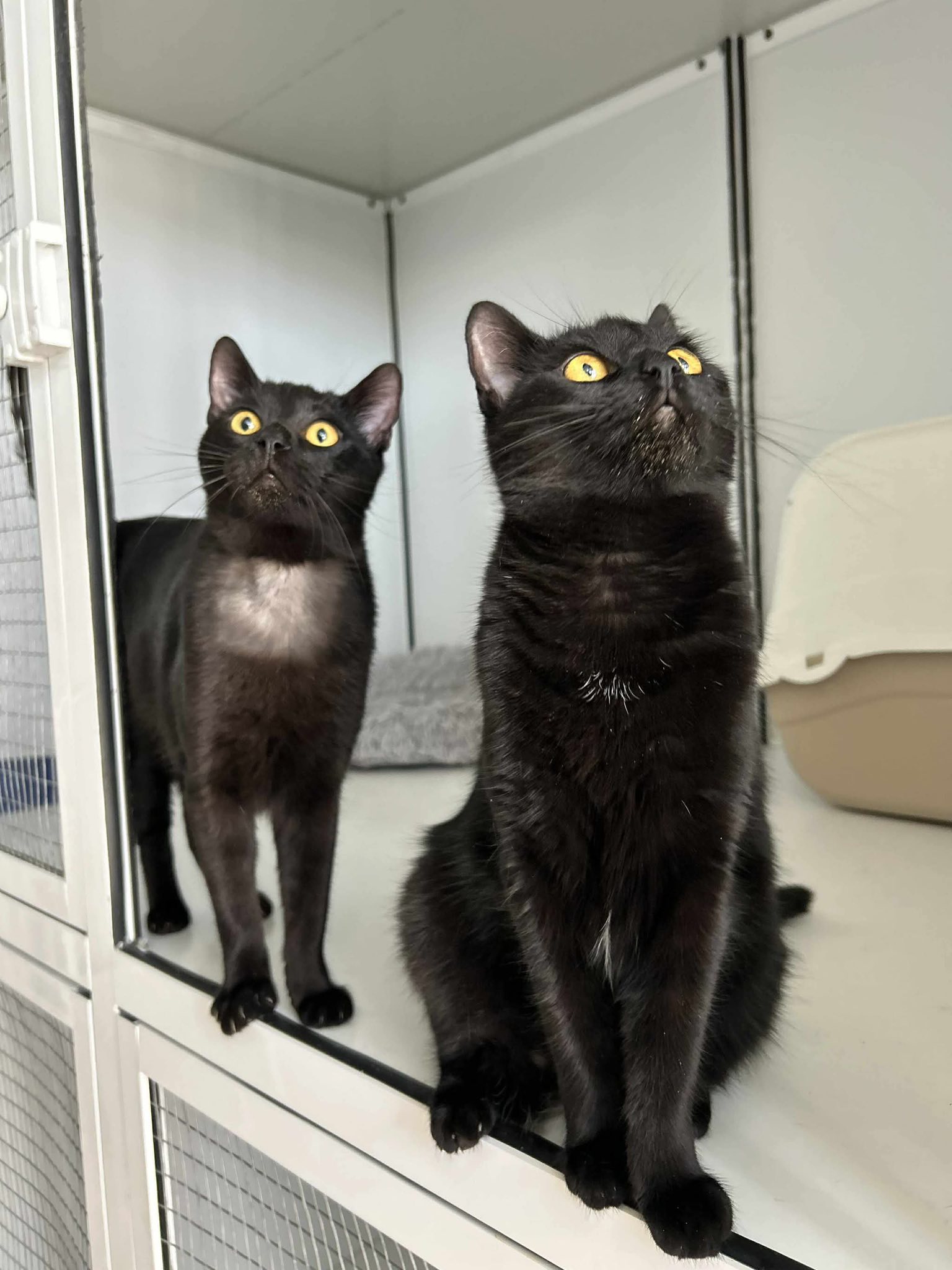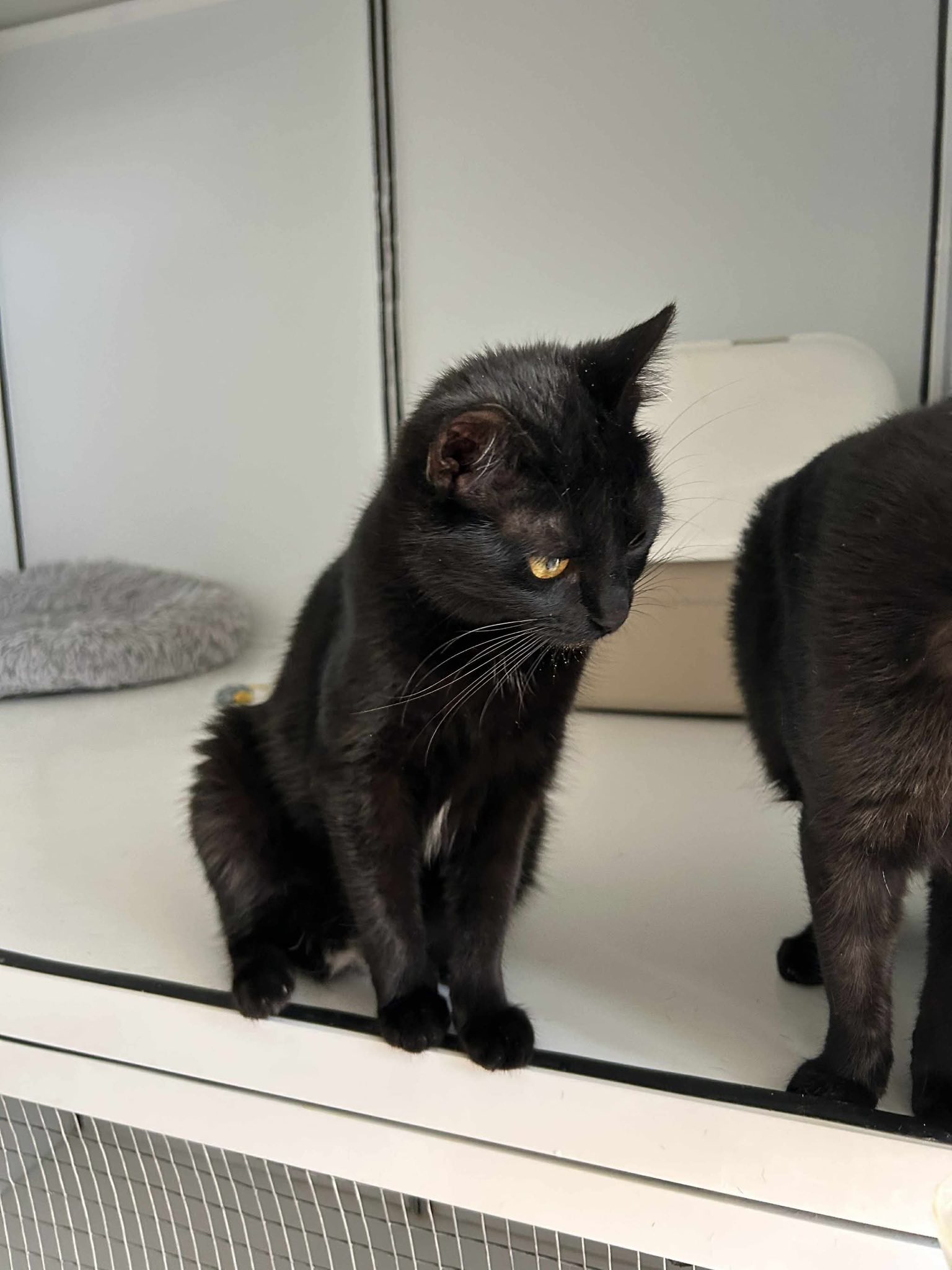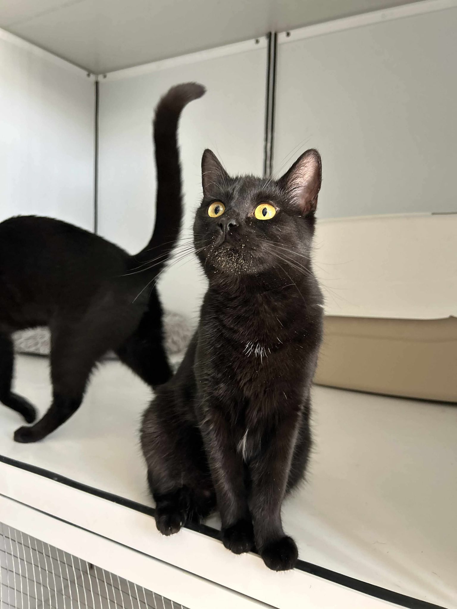 Dieses tolle schwarze Mädchen hat uns sofort begrüßt, als wir Spielbälle und Leckerlis für sie dabei hatten. Sie war überhaupt nicht schüchtern und hat sich auch sofort streicheln lassen. Tiffany lebt momentan leider im Quarantänebereich, bis in den Familienzimmern Platz ist. Man merkt ihr wirklich an, wie sehr sie die Aufmerksamkeit sucht und vermisst. Es ist wirklich nicht schön, für so ein liebes, soziales Madchen im Kafig zu sitzen, und es wäre toll, wenn ihr da draußen jemand eine Chance geben würde.