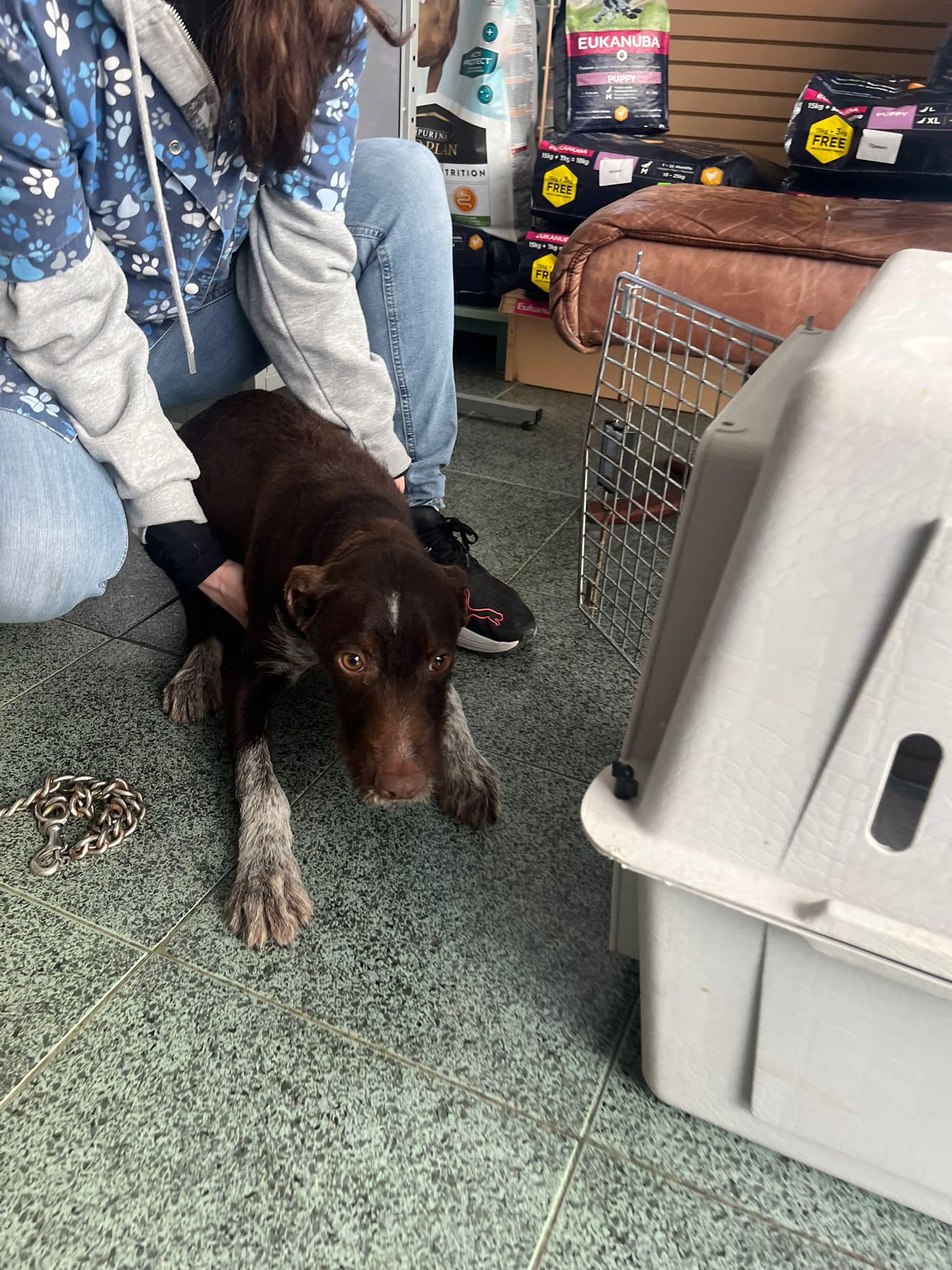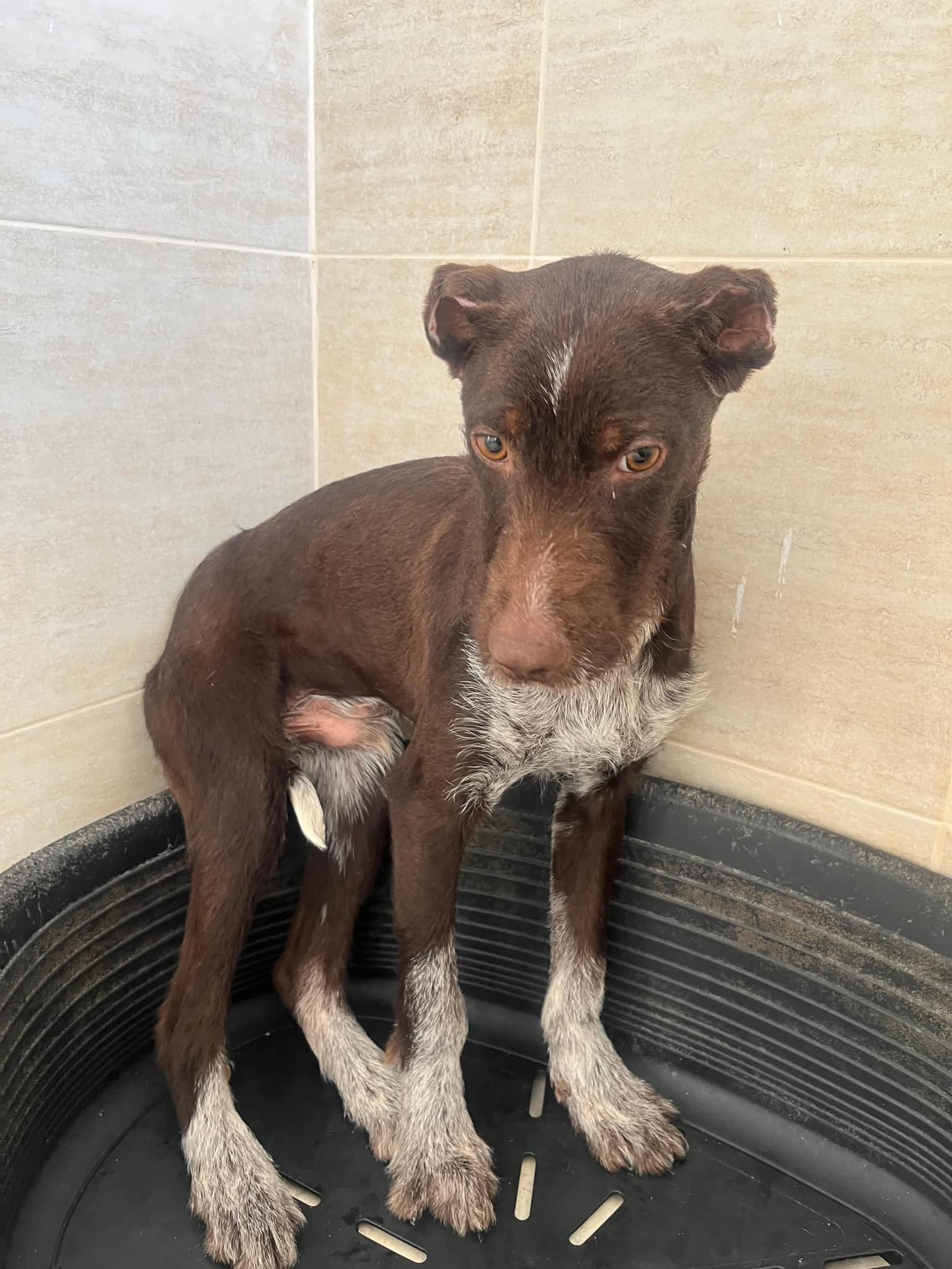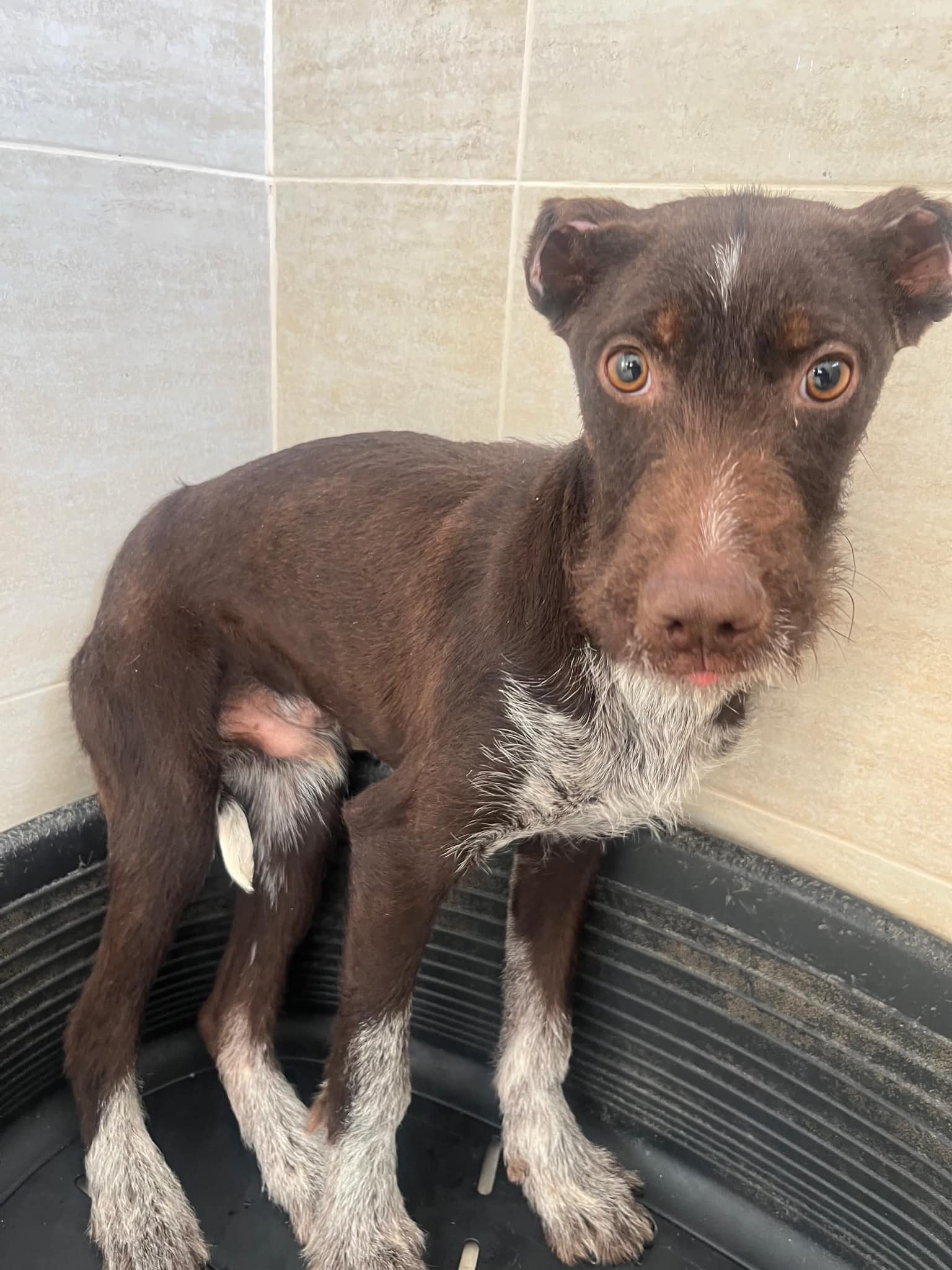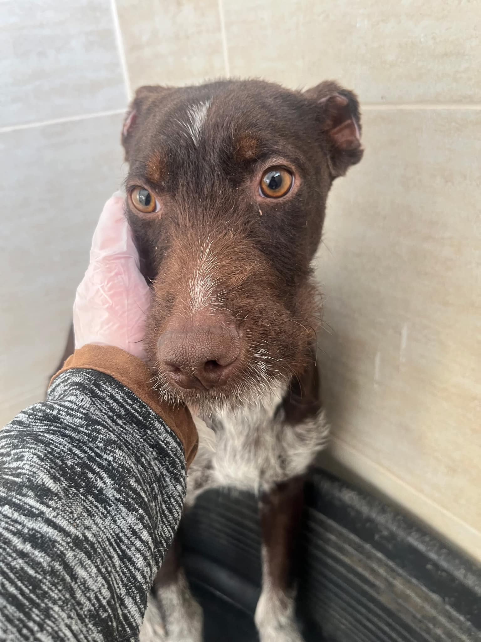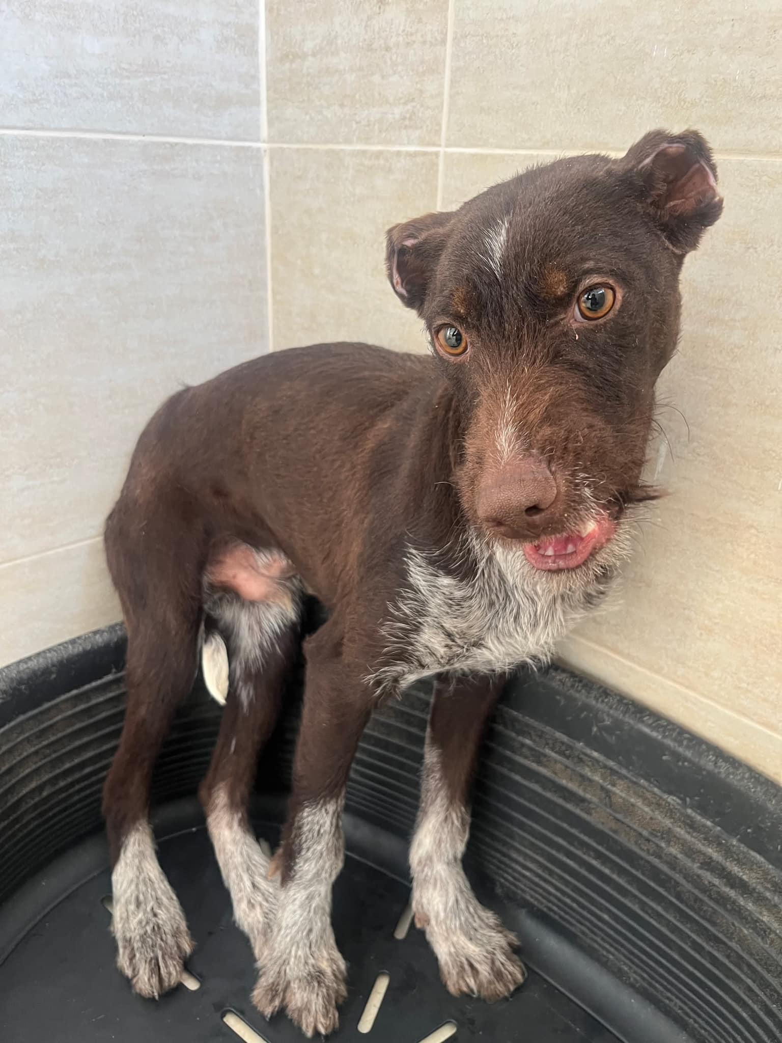 Bibi hat ihn entdeckt und bat unseren Tierarzt beim Einfangen zu helfen, da er sehr ängstlich war. Sie brachten ihn dann zum Check-up in die Klinik und von da aus in unser Rescue Center von wags his tail. Zur Rasse wird vermutet, dass ein „Deutscher Drahthaar“ in im steckt.