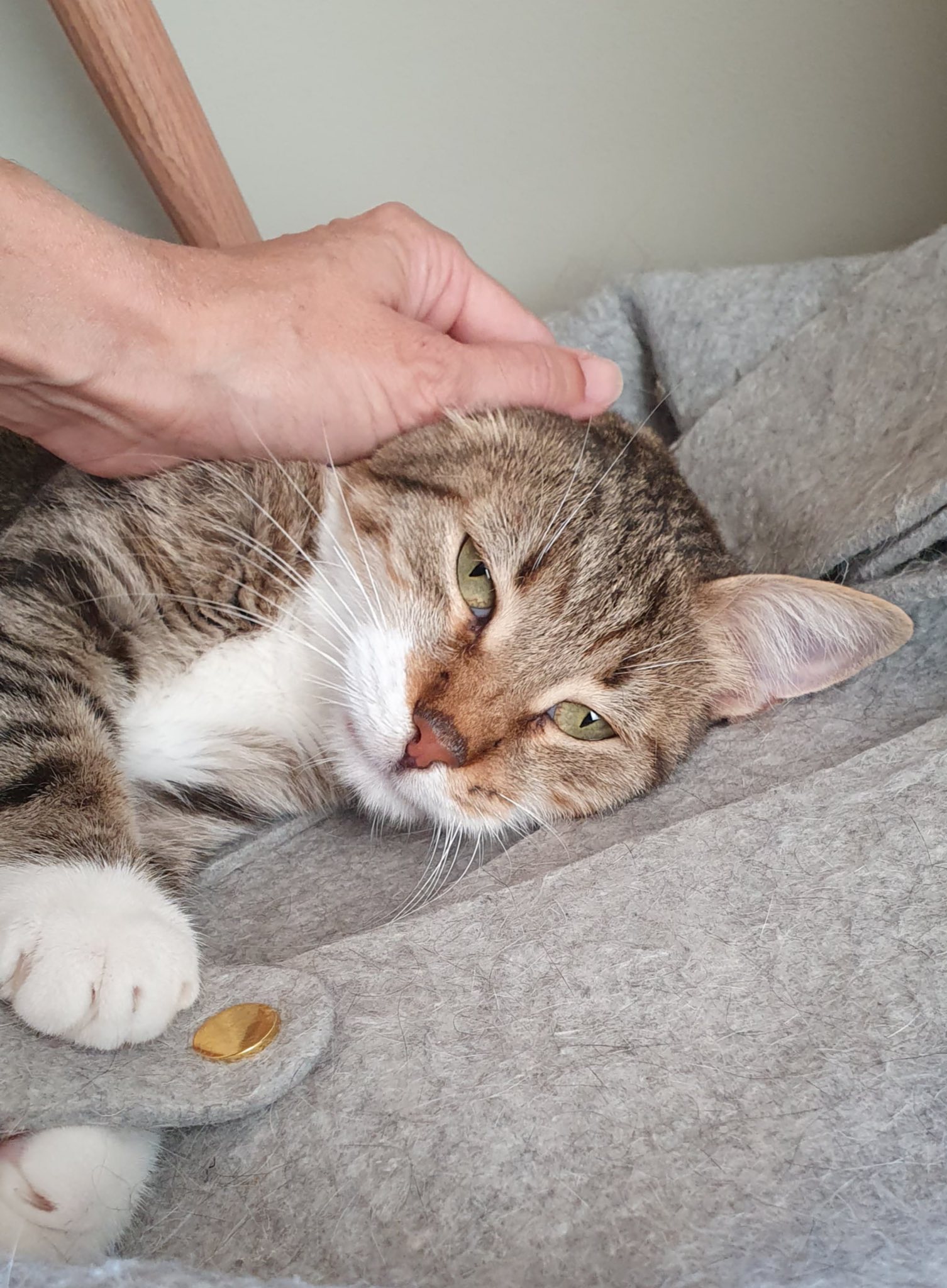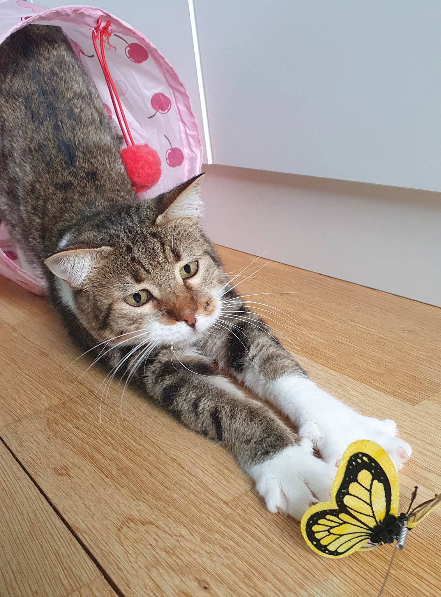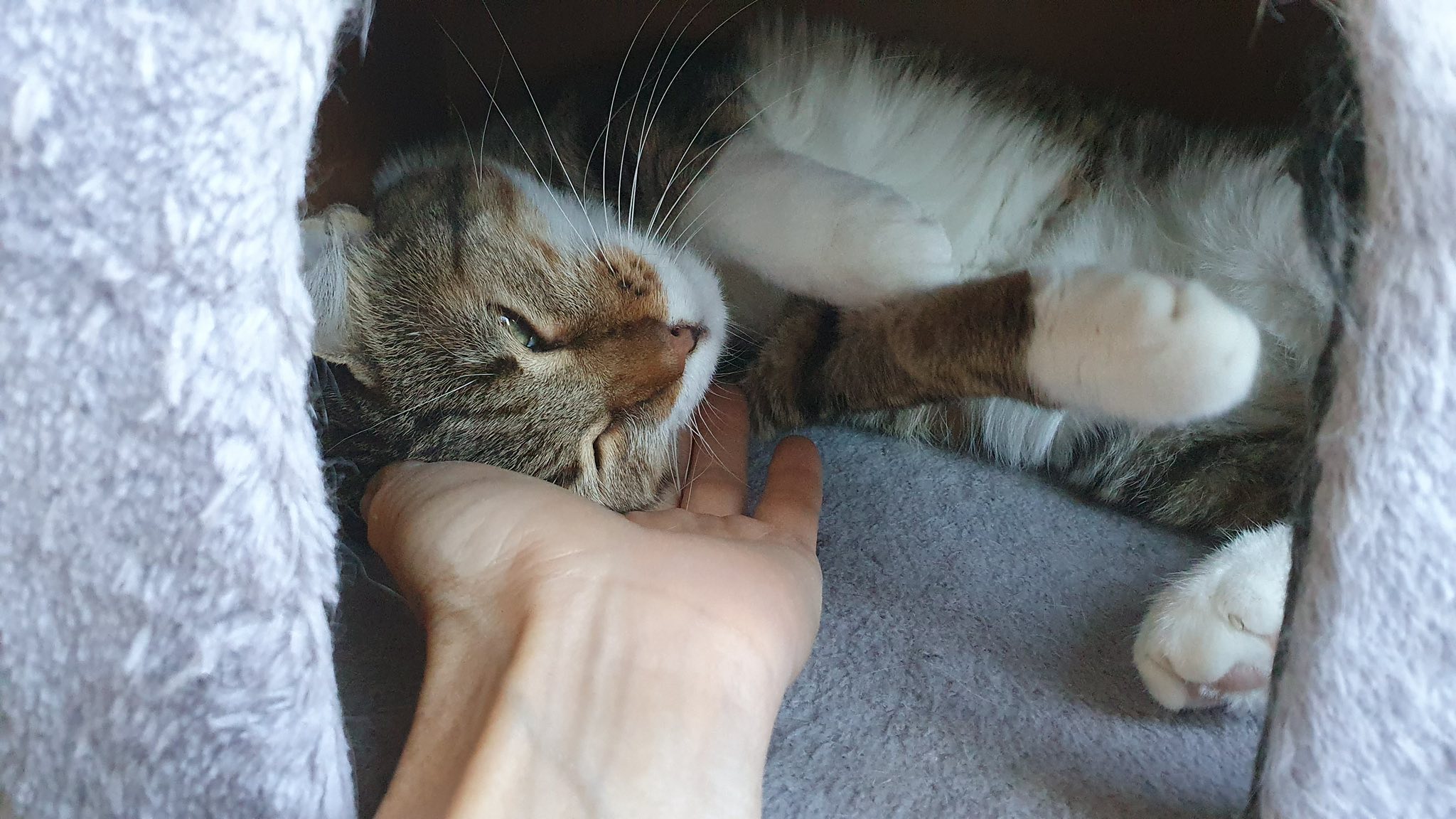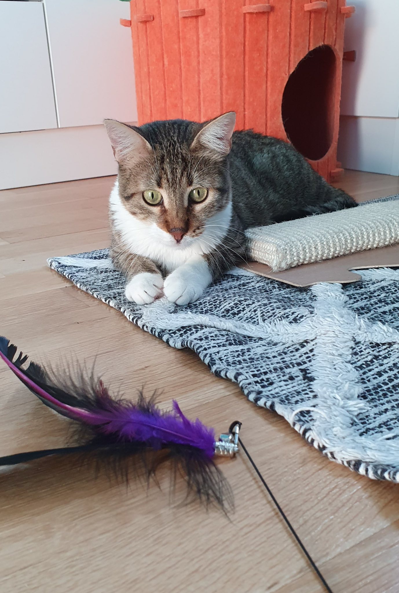 Erik ist ruhiger geworden. Er genießt es sehr, gestreichelt zu werden, schnurrt und reibt seine Pfoten, lässt sich den Bauch kraulen. Aber im Moment lässt er sich nur in seinem Katzenhaus und seinem Bett im Badezimmer streicheln. Außerhalb seiner Lieblingsplätze meidet er uns noch 🙈 Ich setze ihn nicht unter Druck, sondern lasse uns langsam Vertrauen aufbauen. Jeden Abend höre ich ihn mit seinen Spielsachen spielen. Er redet und sucht den Kontakt zu Nelly, aber sie hat Angst vor ihm und faucht ihn an. Er ist eine süße und neugierige kleine Maus.