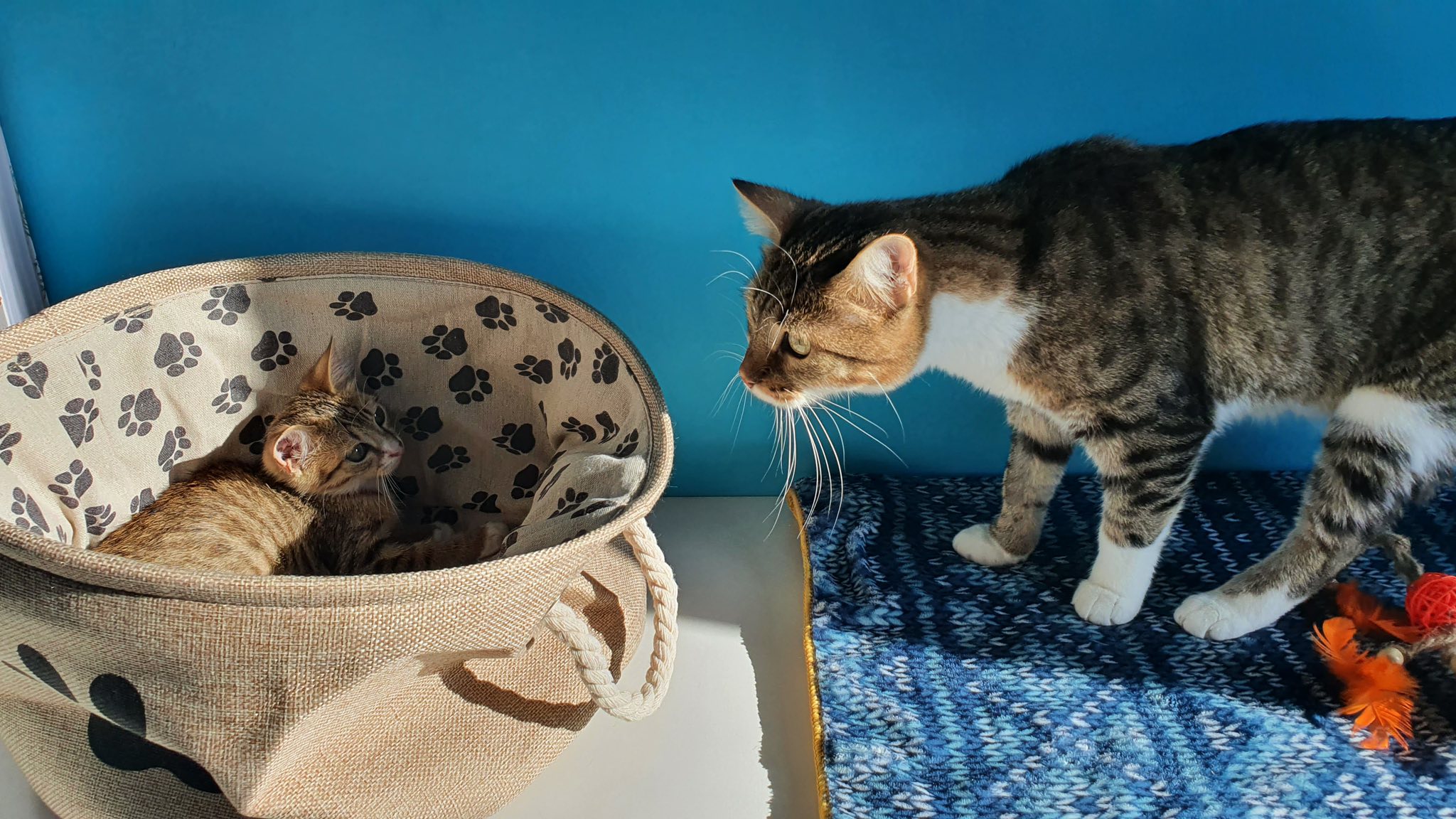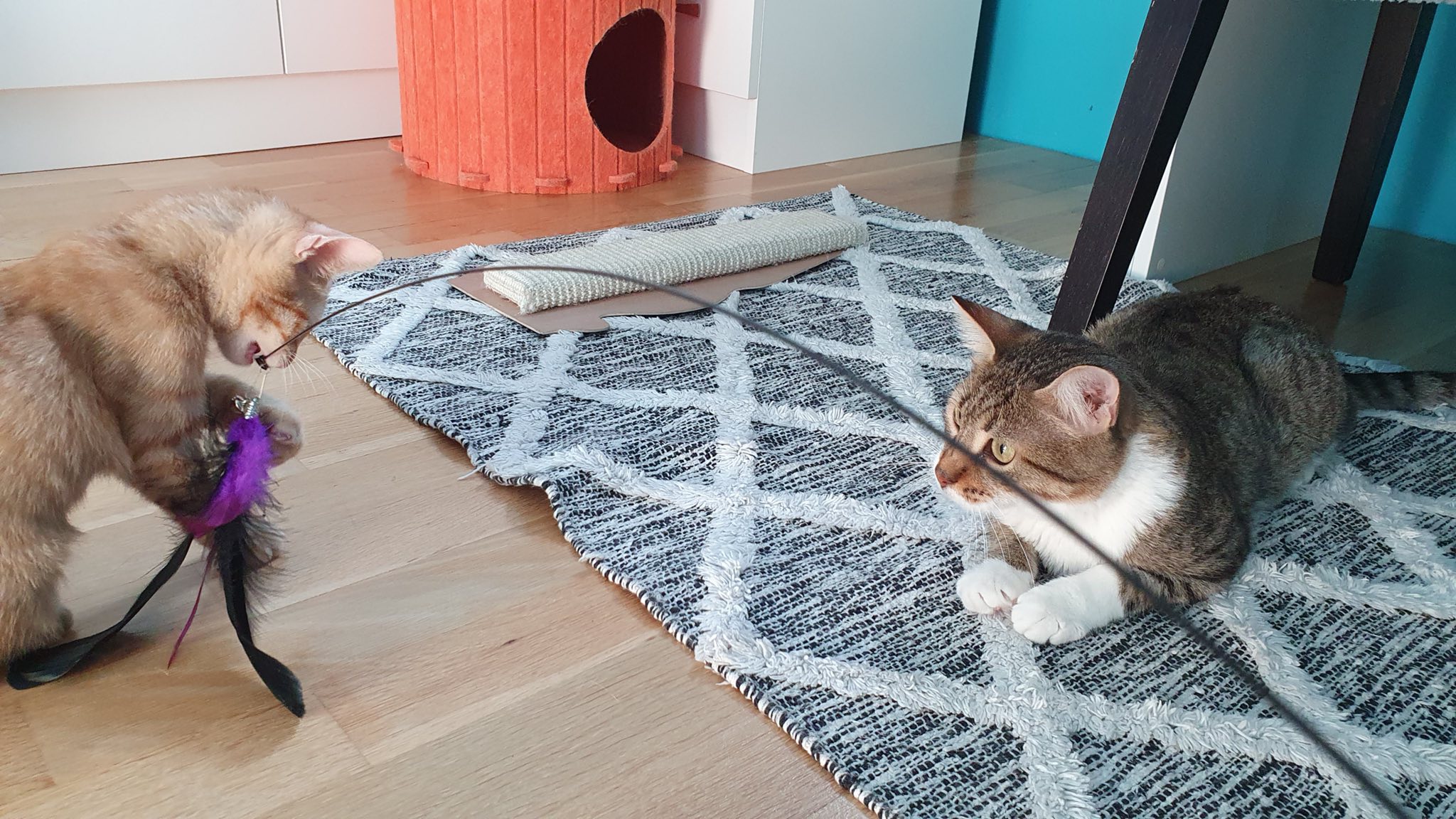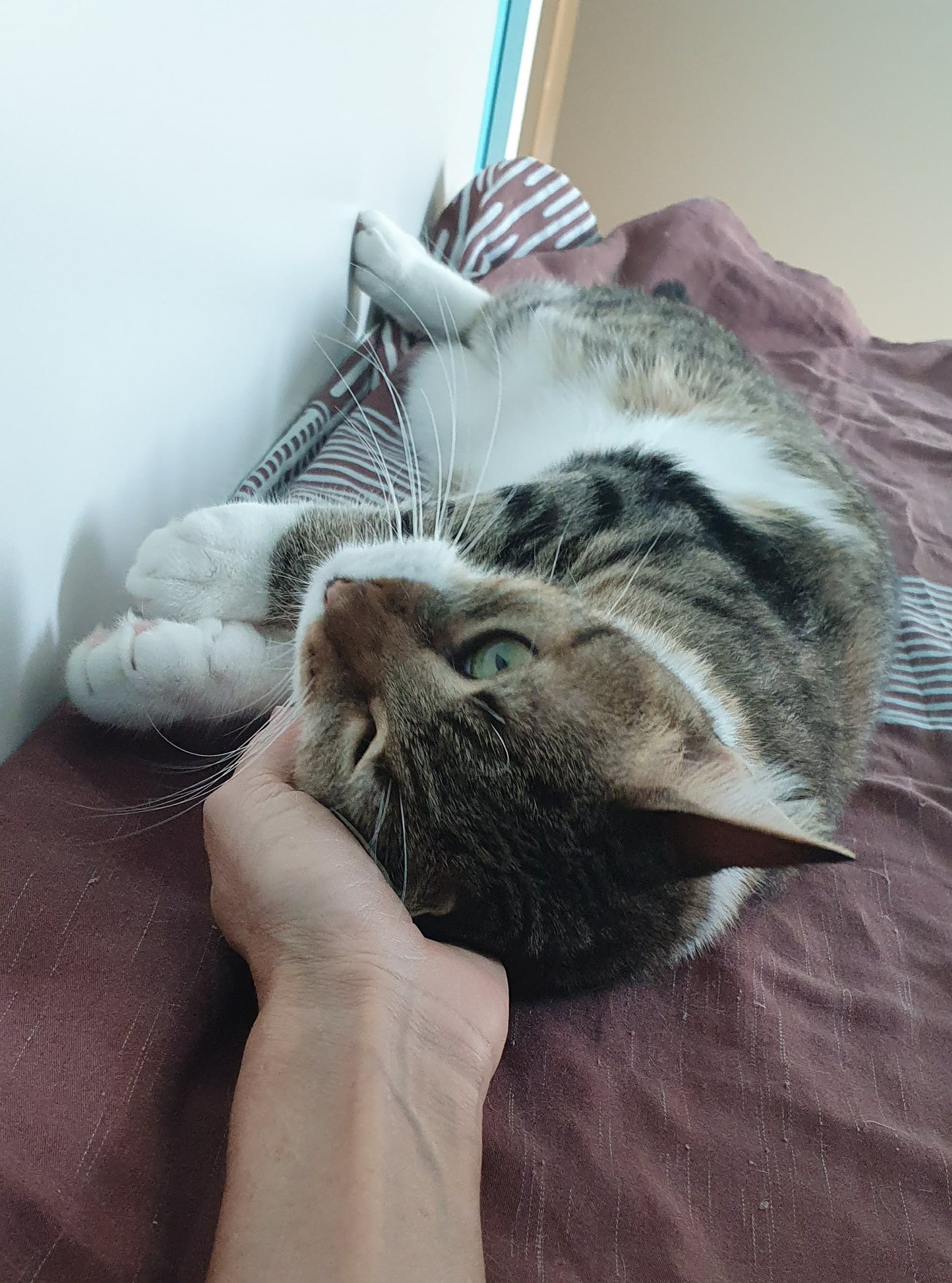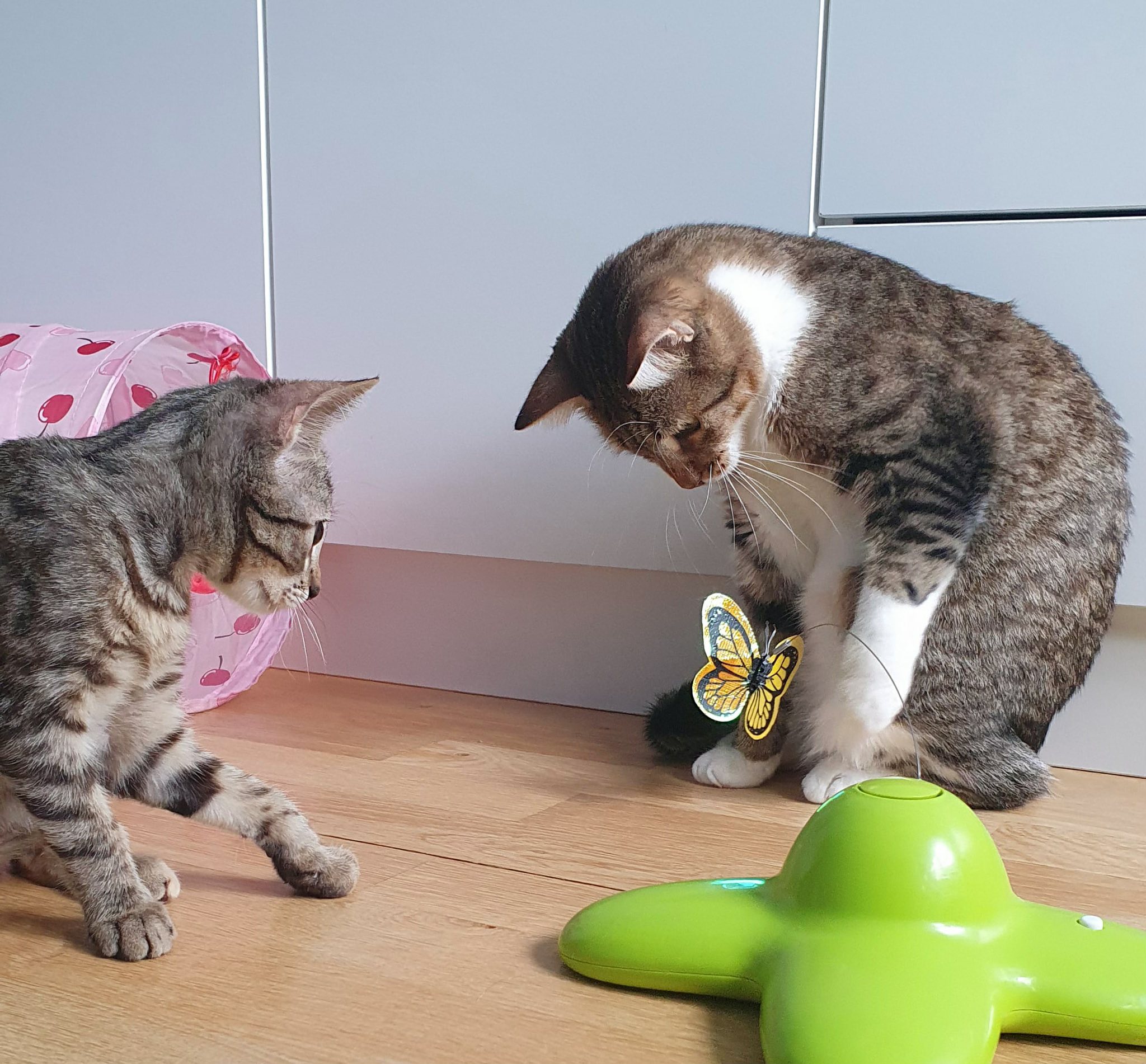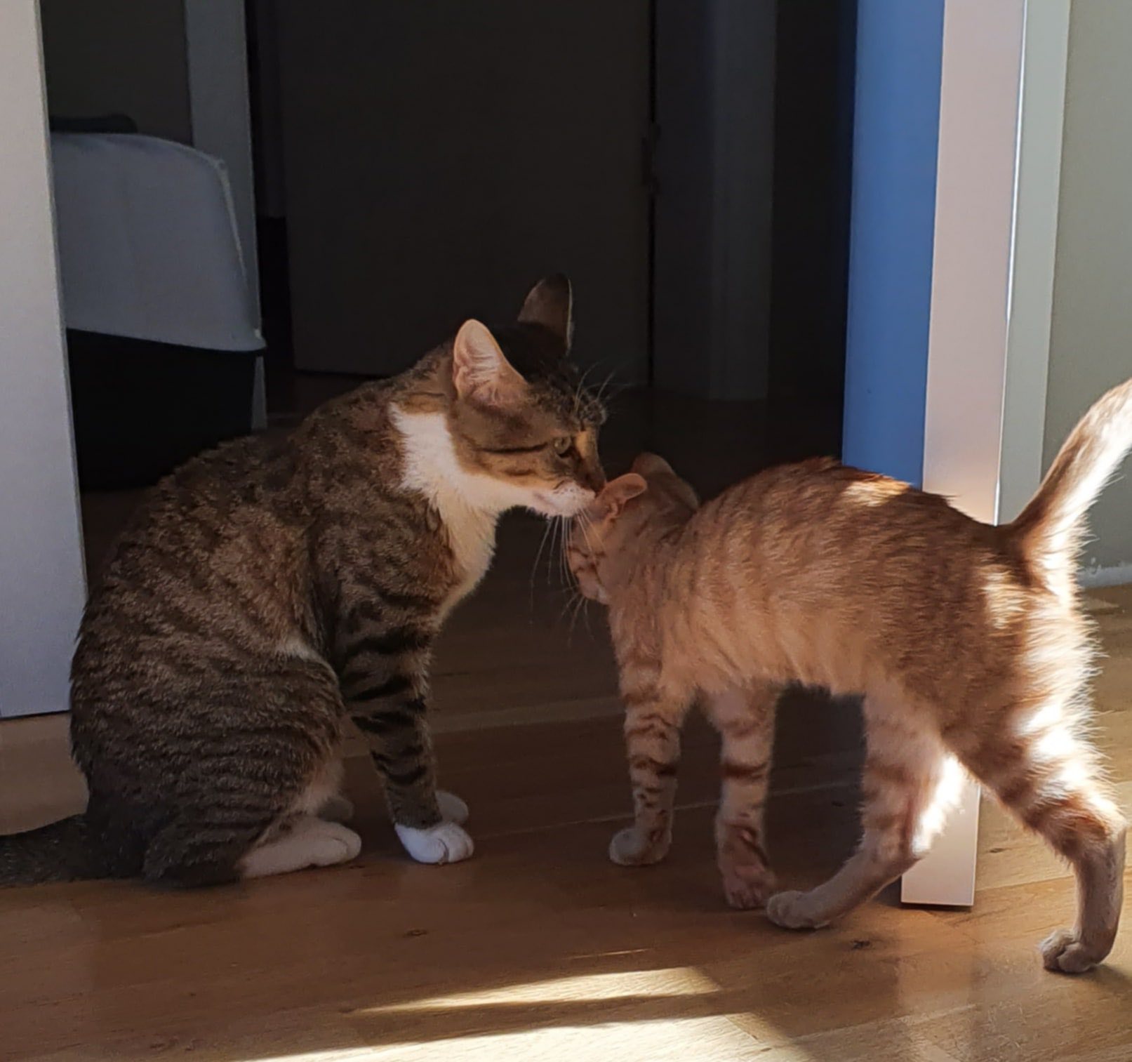Erik ist ruhiger geworden. Er genießt es sehr, gestreichelt zu werden, schnurrt und reibt seine Pfoten, lässt sich den Bauch kraulen. Aber im Moment lässt er sich nur in seinem Katzenhaus und seinem Bett im Badezimmer streicheln. Außerhalb seiner Lieblingsplätze meidet er uns noch 🙈 Ich setze ihn nicht unter Druck, sondern lasse uns langsam Vertrauen aufbauen. Jeden Abend höre ich ihn mit seinen Spielsachen spielen. Er redet und sucht den Kontakt zu Nelly, aber sie hat Angst vor ihm und faucht ihn an. Er ist eine süße und neugierige kleine Maus.
