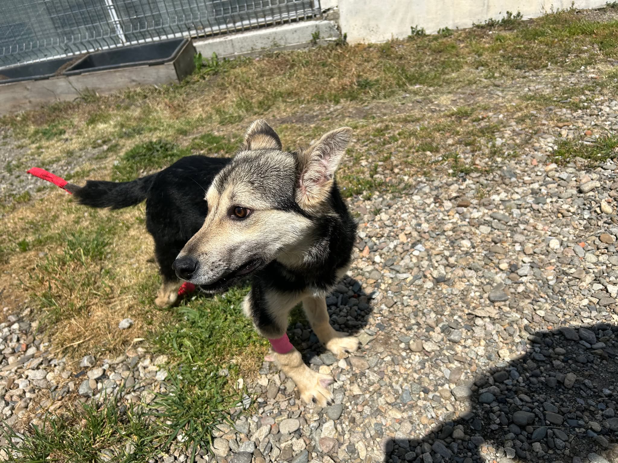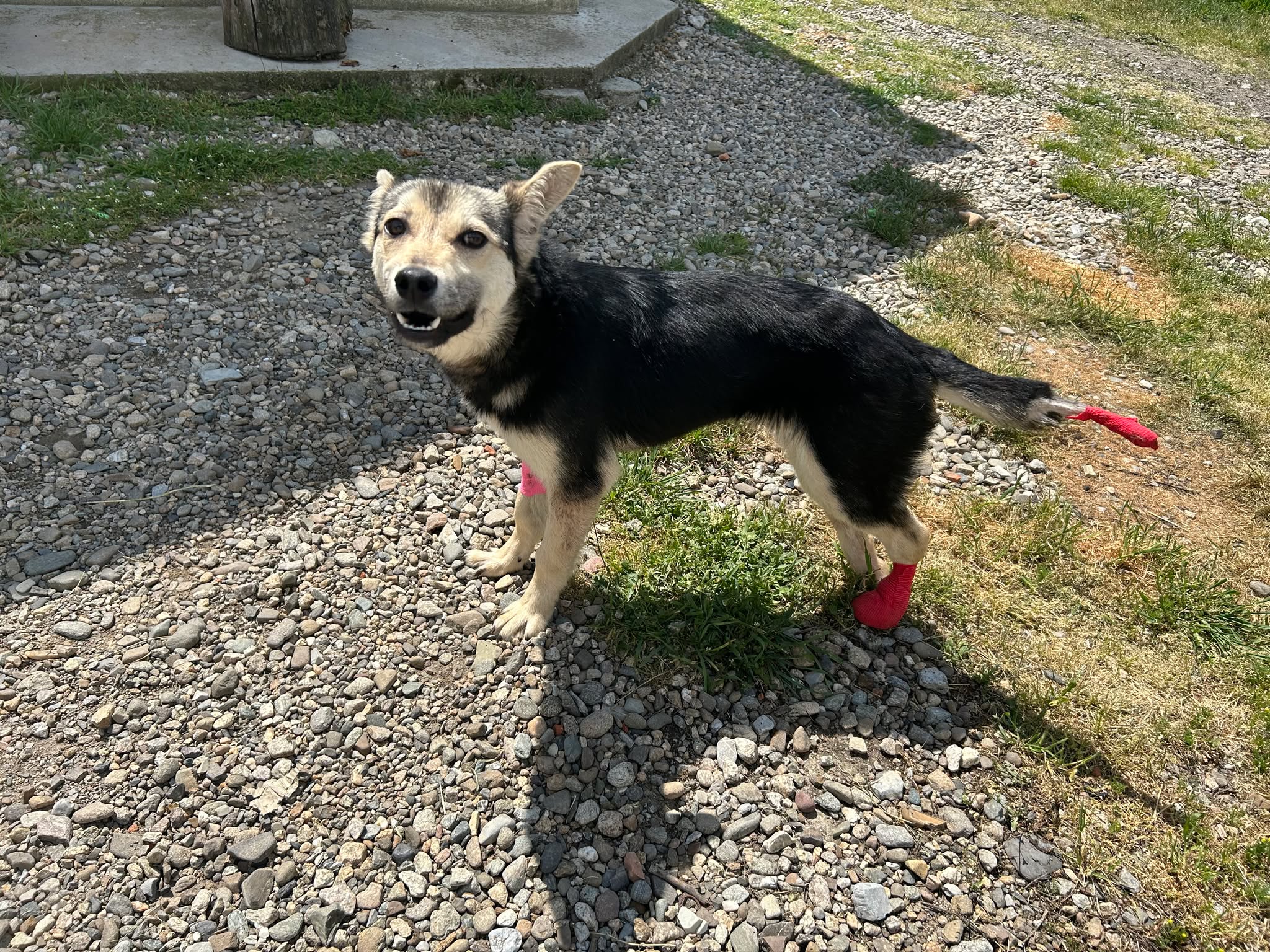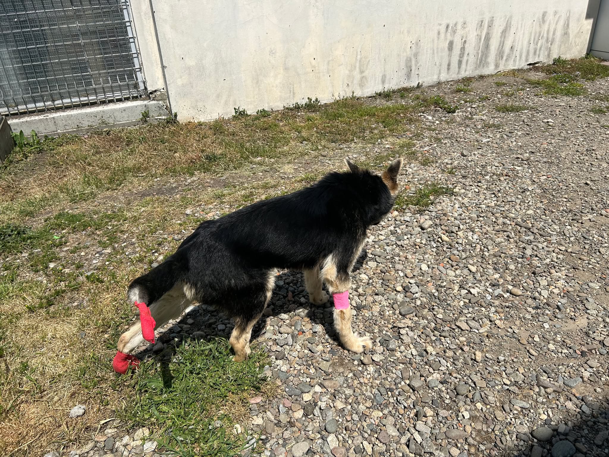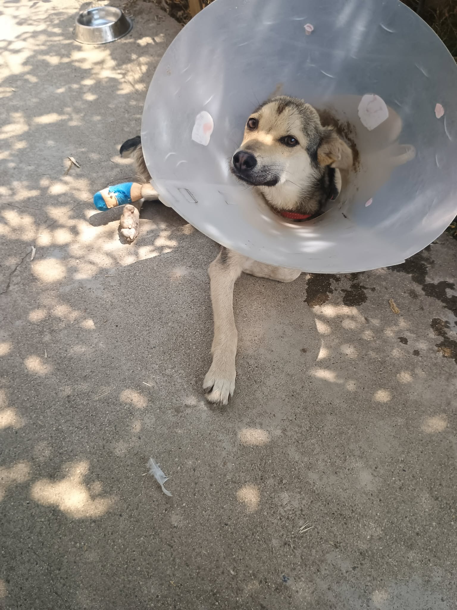 Die Ärzte kappten/versiegelten ihm ab 2/3 seiner linken Pfote die Nerven und nahmen ihm den irreparablen Stück seiner Rute ab. Mit Strahlentherapie, Akupunktur, Schmerzmittel und weitere benötigte Behandlungen, gepaart mit viel Fürsorge und Liebe ging es etwas aufwärts. Die Wunden verheilten und er sollte bereit sein, für einen Neuanfang. Am Montag (26.05.25) wurde dann Mango in Sofia abgeholt. Die noch nicht ganz verheilte Wunde sollte noch mit einer Wärmelampe behandelt werden. Diese wurde dann auf dem “Nachhauseweg” in den Shelter noch eingekauft. Dort angekommen humpelte er in seinem Quarantäne-Zimmerchen fröhlich auf die Pflegerin zu, holte sich seine Leckerchen ab und es schien überstanden.😅 Doch das Glück 🍀 war nur von kurzer Dauer. Sobald er am Abend allein gelassen wurde, hörte man wieder diesen Schmerzensschrei der Verzweiflung 😔 Gott sei Dank war unsere Pflegerin Bibi noch vor Ort. Und wieder war alles voller Blut. Trotz Trichter (!) und Verband (!), hatte Mango es geschafft an seine Pfote zu kommen und diese wieder zu zerfetzen. Die ganz schlimmen Bilder können wir niemanden zumuten werden von uns nicht gepostet. Bibi hat geistesgegenwärtig, sofort die Pfote desinfiziert und ein neues Verband drum gemacht. Schließlich ihn ins Auto gepackt und am gleichen Abend zurück nach Sofia gebracht. Noch aus dem Auto heraus schickte sie uns eine Sprachnachricht. Man hörte die Verzweiflung, die Sorge und den Schock in ihrer Stimme….. Nun ist Mango wieder in Sofia. Er wurde sofort behandelt, bekam Schmerzstiller, die Pfote wurde neu bandagiert und es stehen weitere Tests aus. Wir wissen zu diesem Zeitpunkt nicht, wie es weitergehen wird. Fakt ist: Er kann erstmal nicht im Shelter sein. Und er braucht medizinische Versorgung. Die Kosten bis vor dem erneuten Einliefern in Sofia beliefen sich auf ca. 1200€ – was jetzt noch folgt, wissen wir nicht. Jeder Tag in der Klinik kostet ca. 16 €. zzgl. der Behandlungen, Medikamente, etc. kann man mit ca. 50 € täglich rechnen. Evtl. steht eine erneute OP im Raum. Wir würden nicht fragen, hätten wir das Geld, um ihm eine Genesung in fachkundige Hände zukommen zu lassen, selbst. Doch die Welpen Flut, Futter und auch kleine medizinische Behandlungen von dem Rest der Tiere, lassen nicht viel Spielraum für so große Taten. Daher bitten wir euch, um eine Spende für Mango