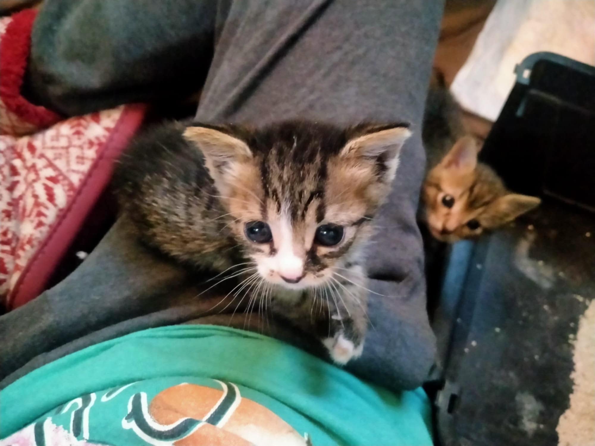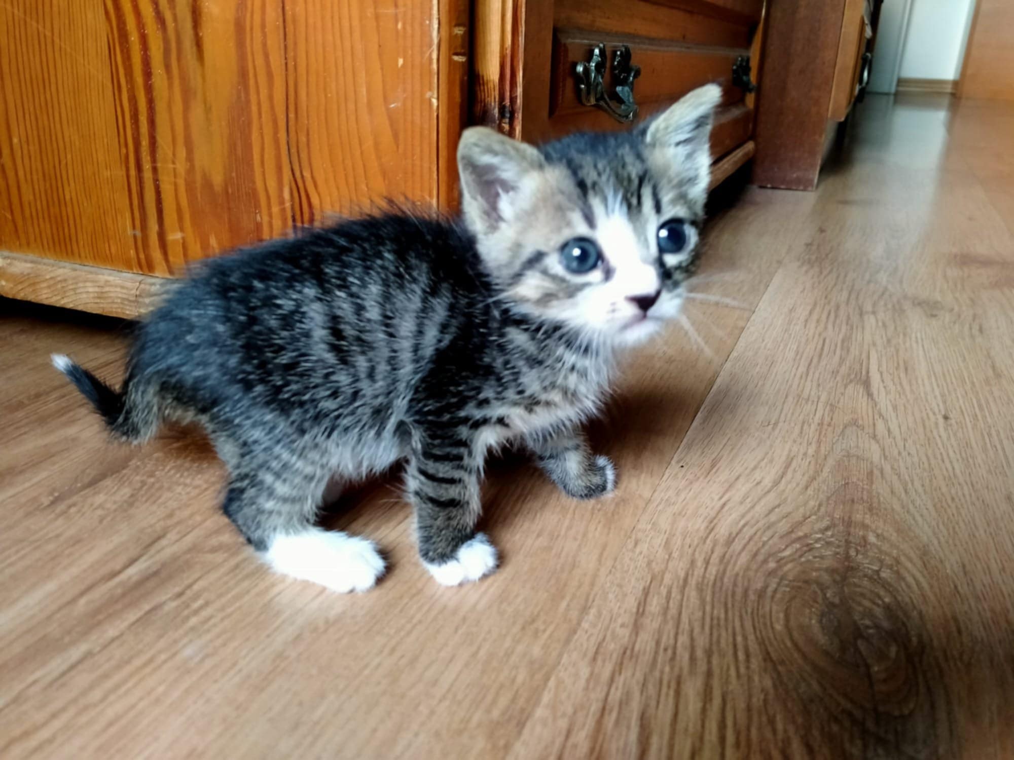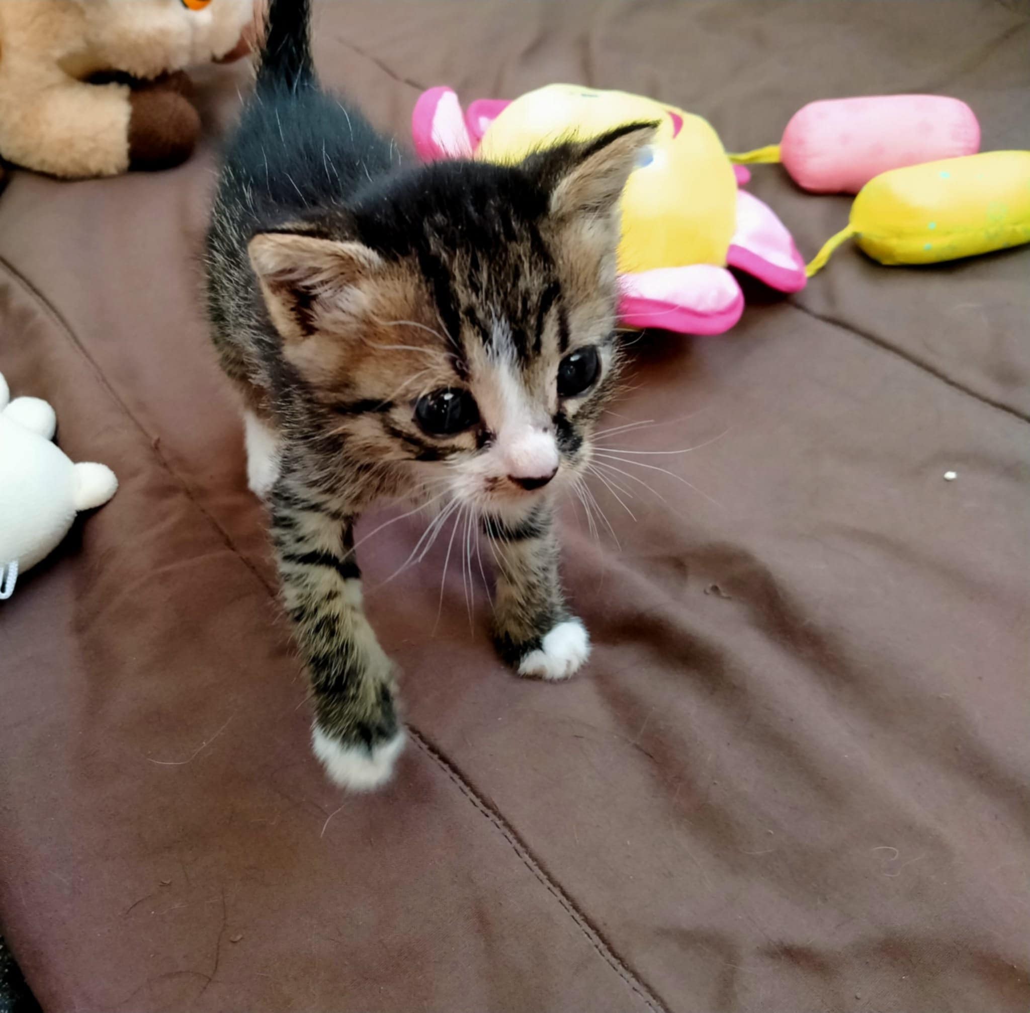 Das Glück kommt unverhofft durch eine Tür, die wir als fest verschlossen glaubten – unbeabsichtigt Leben gerettet Petyas Freund arbeitet als Händler für abgepackte Lebensmittel. Er brachte eines Abends 2 kleine Kitten mit nach Hause. Sein Kollege holt immer an einer Baustelle leere Kartons ab, die eigentlich zur Entsorgung gedacht sind. an diesem Tag machten sie in einer der Kartons einen grausigen Fund. In einem Ter Kartons befanden sich 2 kleine Kitten. etwa 3 Wochen alt, ohne Zähne und mit trüben Augen. Das Grausame ist nicht die Tatsache, dass die Kitten in einer dieser Kartons zum Entsorgen gebracht wurden, sondern, dass 5 Minuten nachdem der Kollege die Kisten eingeladen hatte, die Kartonpresse anrollte um alle Kartons zu pressen. Hätte er nicht diese Kartons eingeladen, wären die beiden qualvoll durch die Kartonpresse zerquetscht worden. Fassungslos über diese Herzlosigkeit, brachte Petya die beiden am nächsten Tag in die Klinik zur Untersuchung. Beide sind gesund und verspielte kleine Kitten. Zwischenzeitlich essen sie auch schon Babyfutter und versuchen sich an Trockenfutter.