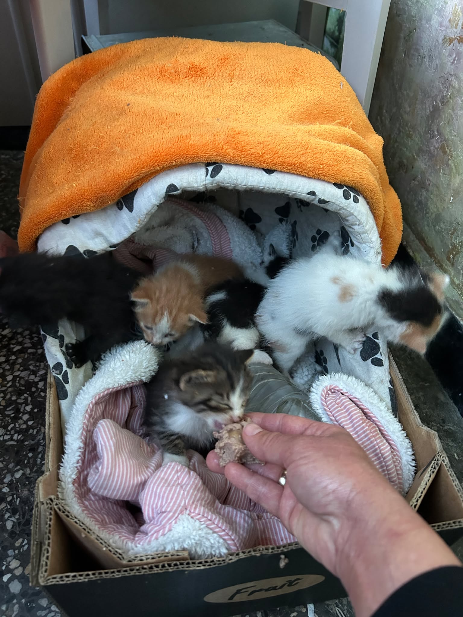 Auf einem verlassenen Grundstück fand sie einen großen Karton. In dem Karton befanden sich 5 kleine Kitten. Alle ca. 3 Wochen alt. Sie wurden herzlos dort ausgesetzt und sich selbst überlassen. Die Kleinen können schon Baby- Pate essen, brauchen aber nach wie vor Milch. Billiana brachte die kleinen zu unserer Kittenflüsterin Nikolina.