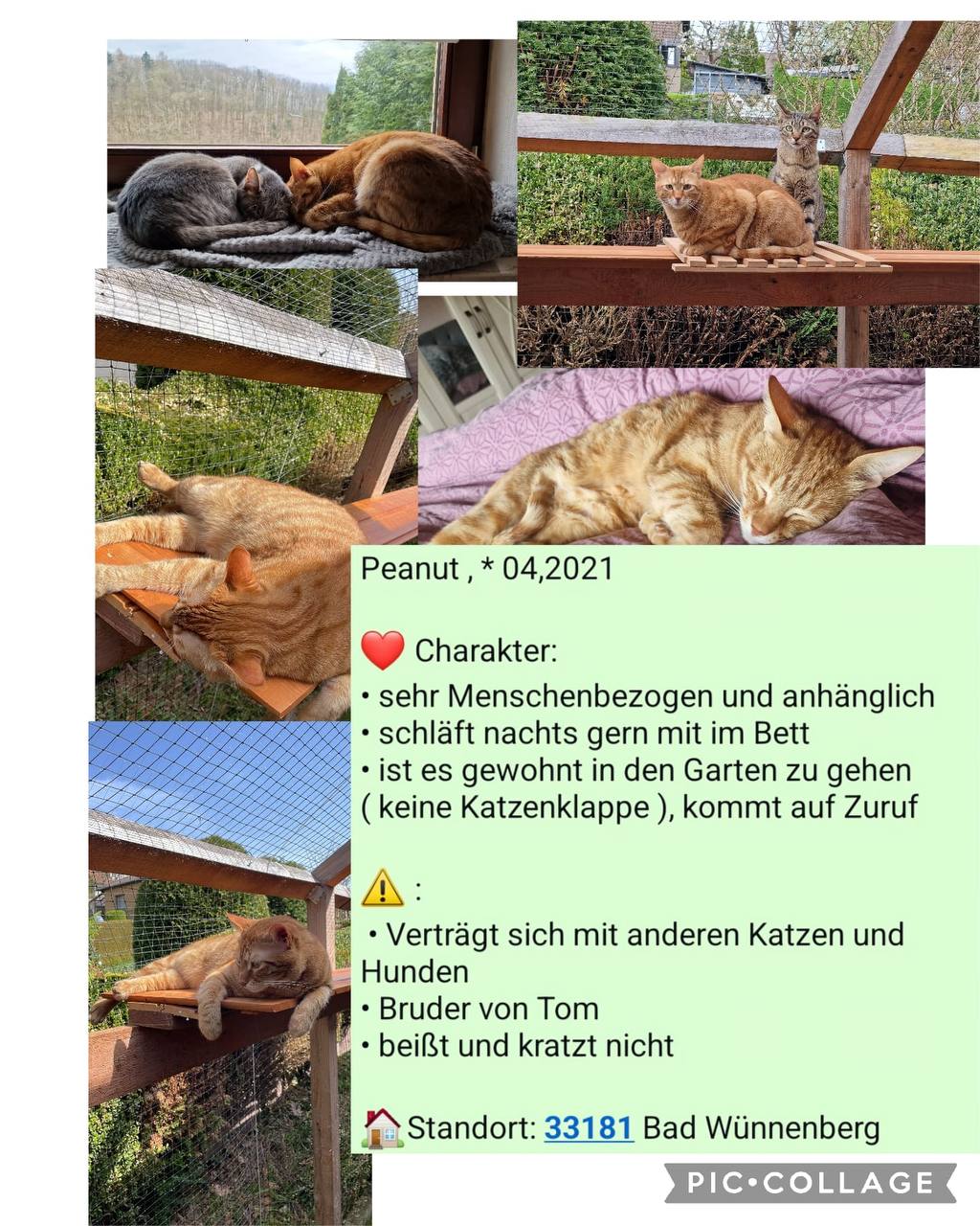 Peanut ist ein sehr anhänglicher und menschenbezogener Kater, welcher nachts gerne mit im Bett schläft. Er ist es gewohnt in den Garten zu gehen und kommt auf Zuruf wieder zurück.