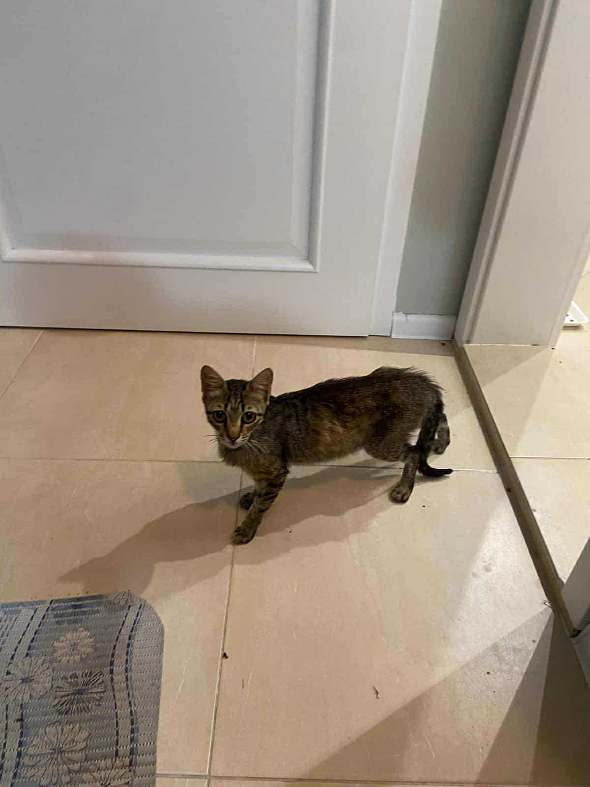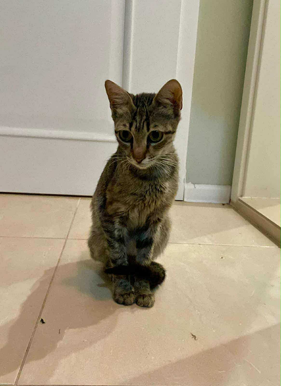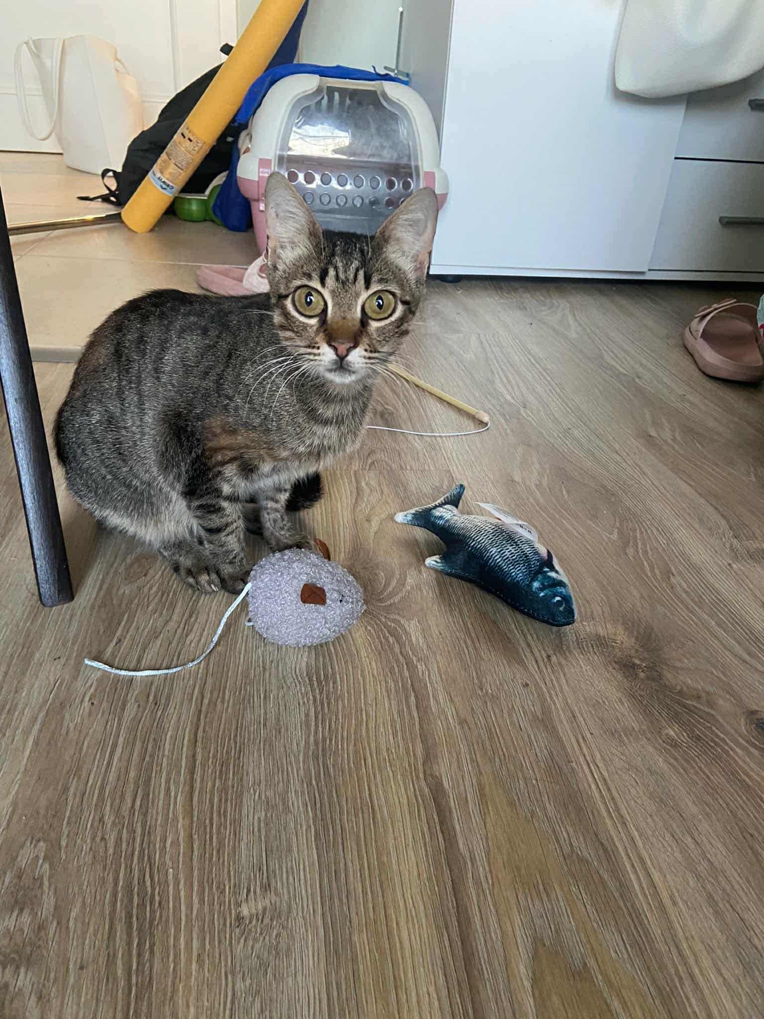 Das nächste Kätzchen ist ebenfalls ein Mädchen – eine kleine, tapfere Seele, die viel zu früh erwachsen und Mutter werden musste. Sie tauchte an einer Baustelle auf, wo Petya gerade bei einer Montagearbeit war. Hungrig, schwach und bereits eine Mama, strich sie um ihre Beine. Natürlich bekam sie sofort Futter, und nachdem sie gegessen hatte, lief sie davon – offenbar zu ihren Babys. Petya bat eine Freundin, die in der Nähe wohnt, sich um sie zu kümmern und ein Auge auf die kleine Maus zu haben.