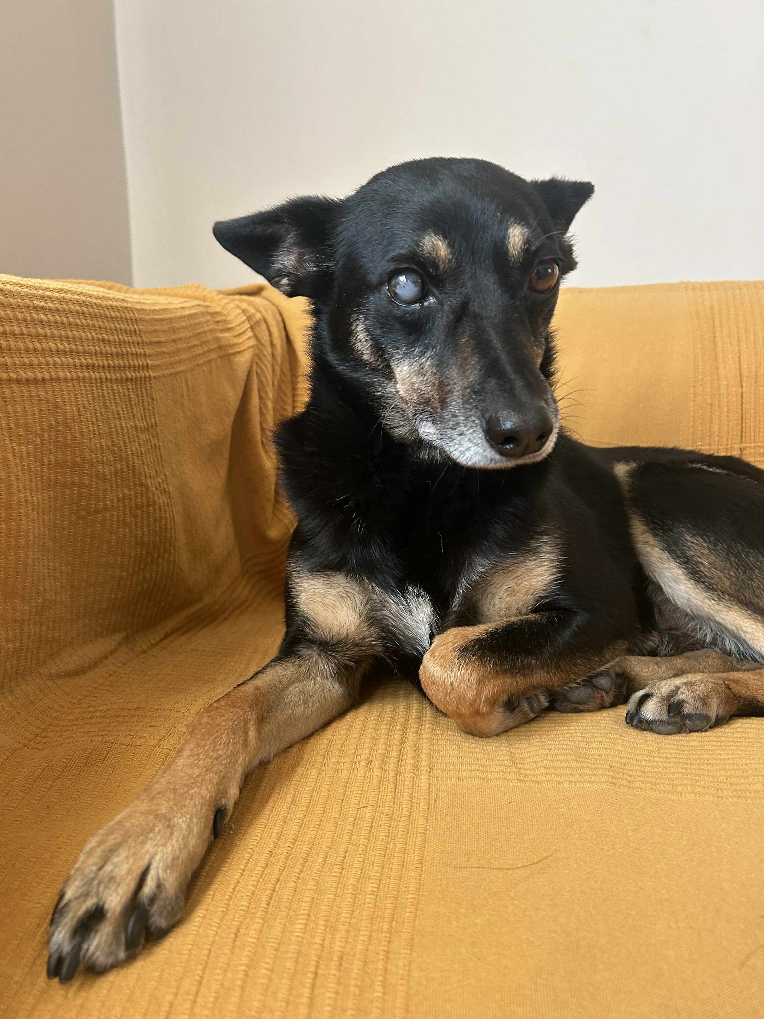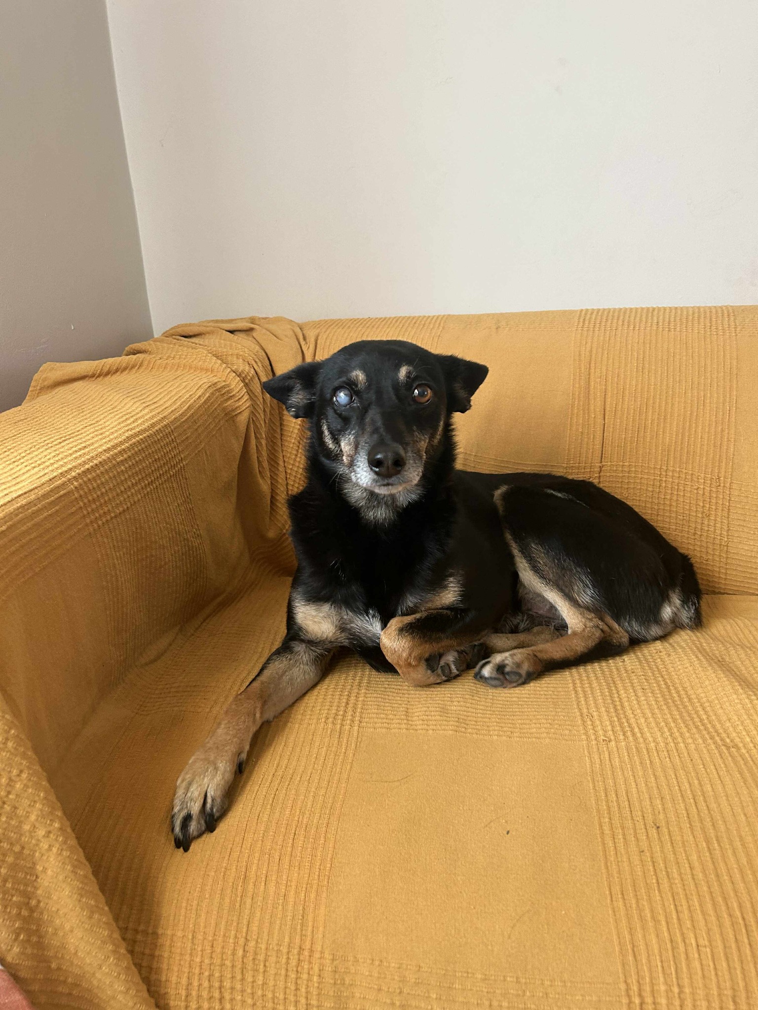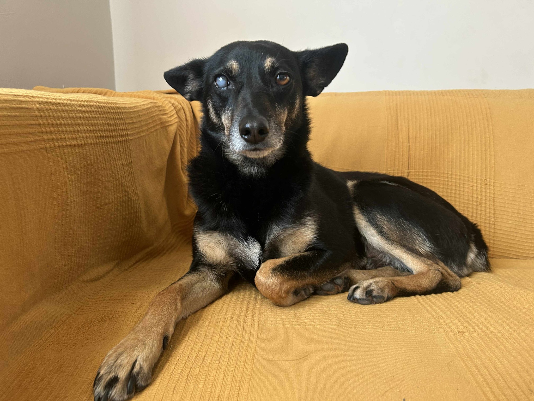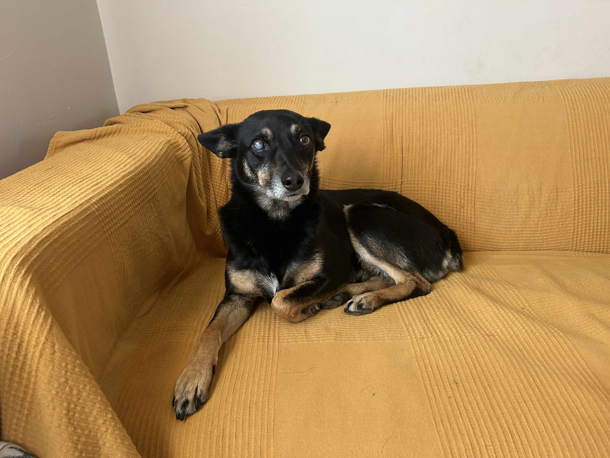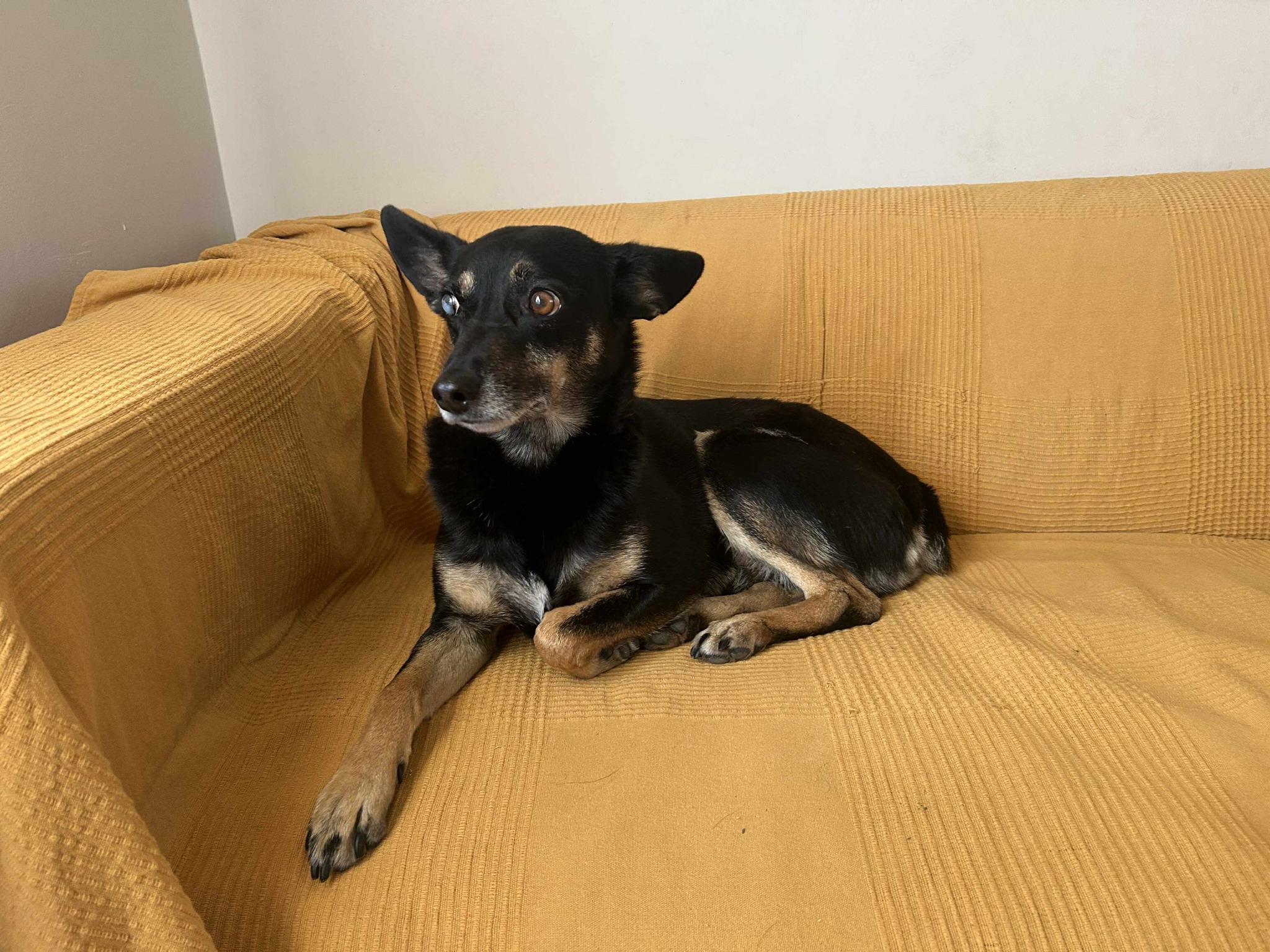 Er ist sehr clever. Er macht nie in seinen Käfig, sondern erledigt alles draußen. An der Leine läuft er perfekt. Ein sehr intelligenter und ruhiger Hund. Er kuschelt gern und liebt Sofas und warme Räume. Es sieht so aus, als ob er das alles schon kennt; wahrscheinlich war er ein Familienhund, bevor er auf die Straße gesetzt wurde.