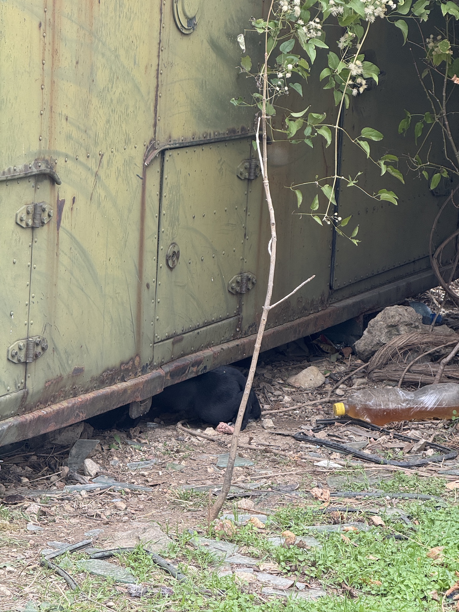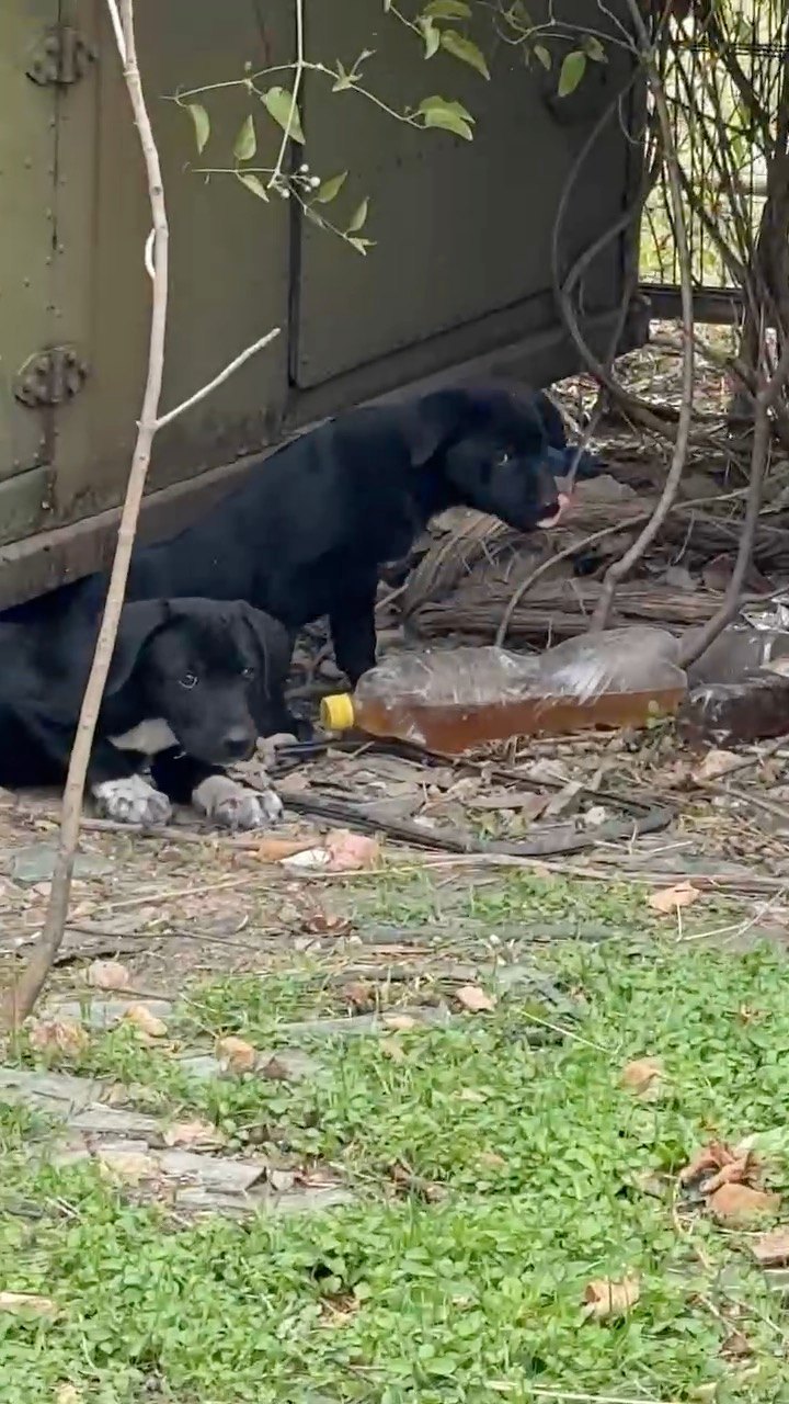 Unsere Tierschützerinnen bekamen ein Video zugeschickt von 2 kleinen Welpen zwischen Wohnhäusern an einem alten, kaputten Wohnwagen o.ä.